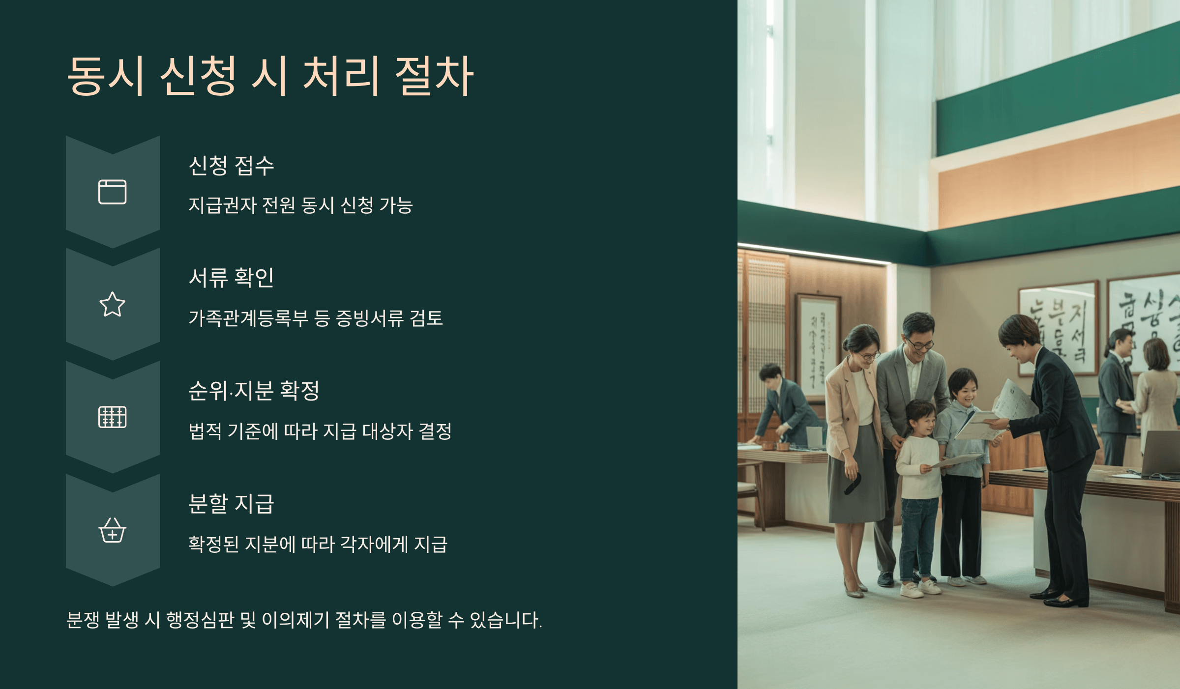 동시에 접수되었다고 해서 연금을 나누거나, 공동으로 받는 구조는 절대 아니에요. 수급권은 1인에게만 인정되고, 우선순위자가 정해지면 다른 유족의 신청은 자동으로 배제되죠. 그래서 신청자가 많더라도 실제 연금은 한 사람에게만 돌아가게 돼요.