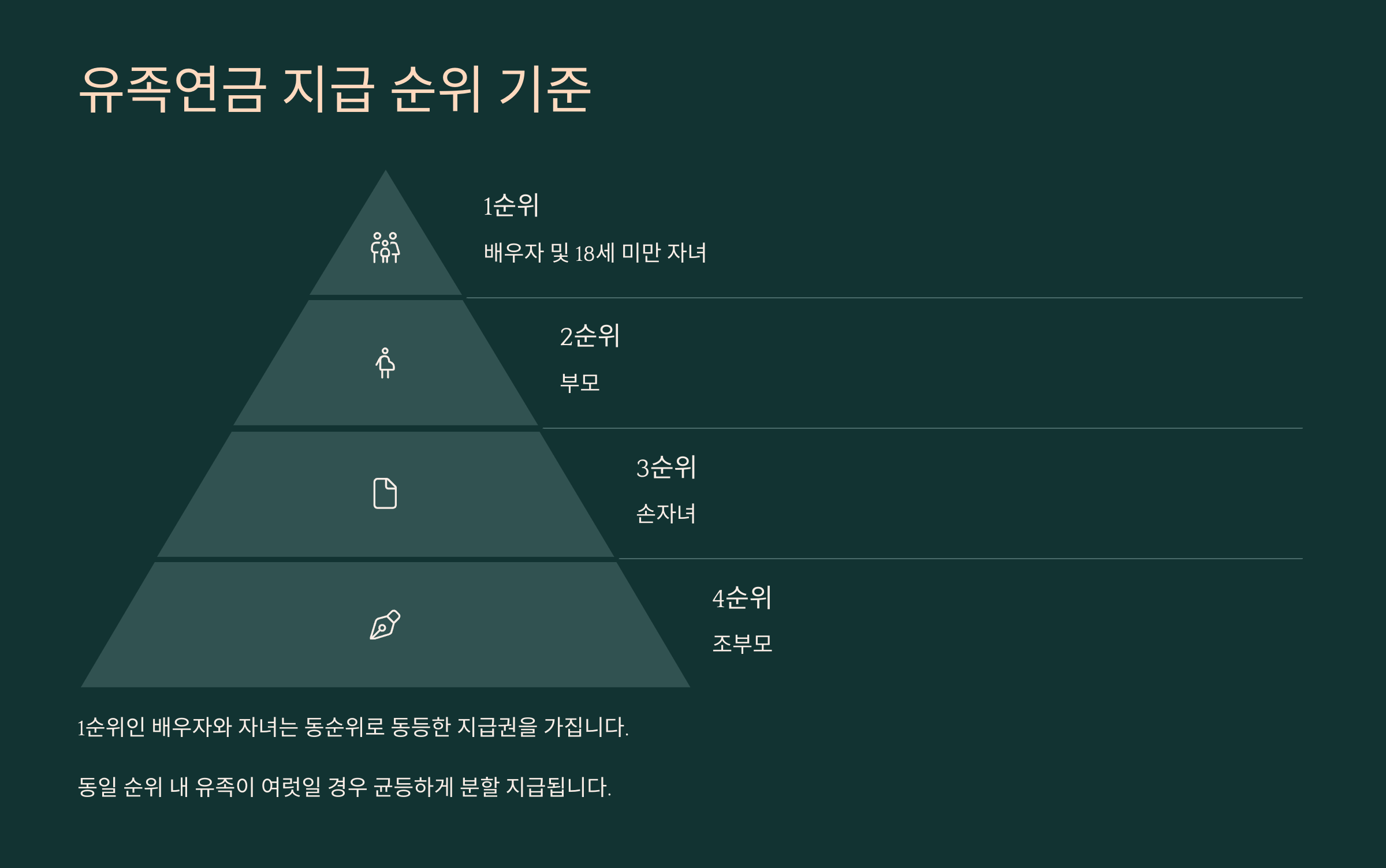 특히 배우자와 자녀가 동시에 존재할 경우, 누가 우선순위인지, 공동으로 받을 수는 없는지, 또 신청 순서에 따라 달라지는 건 아닌지 궁금하신 분들이 많아요. 유족연금 지급에는 명확한 법적 기준이 있고, 이에 따라 우선순위가 정해지죠.