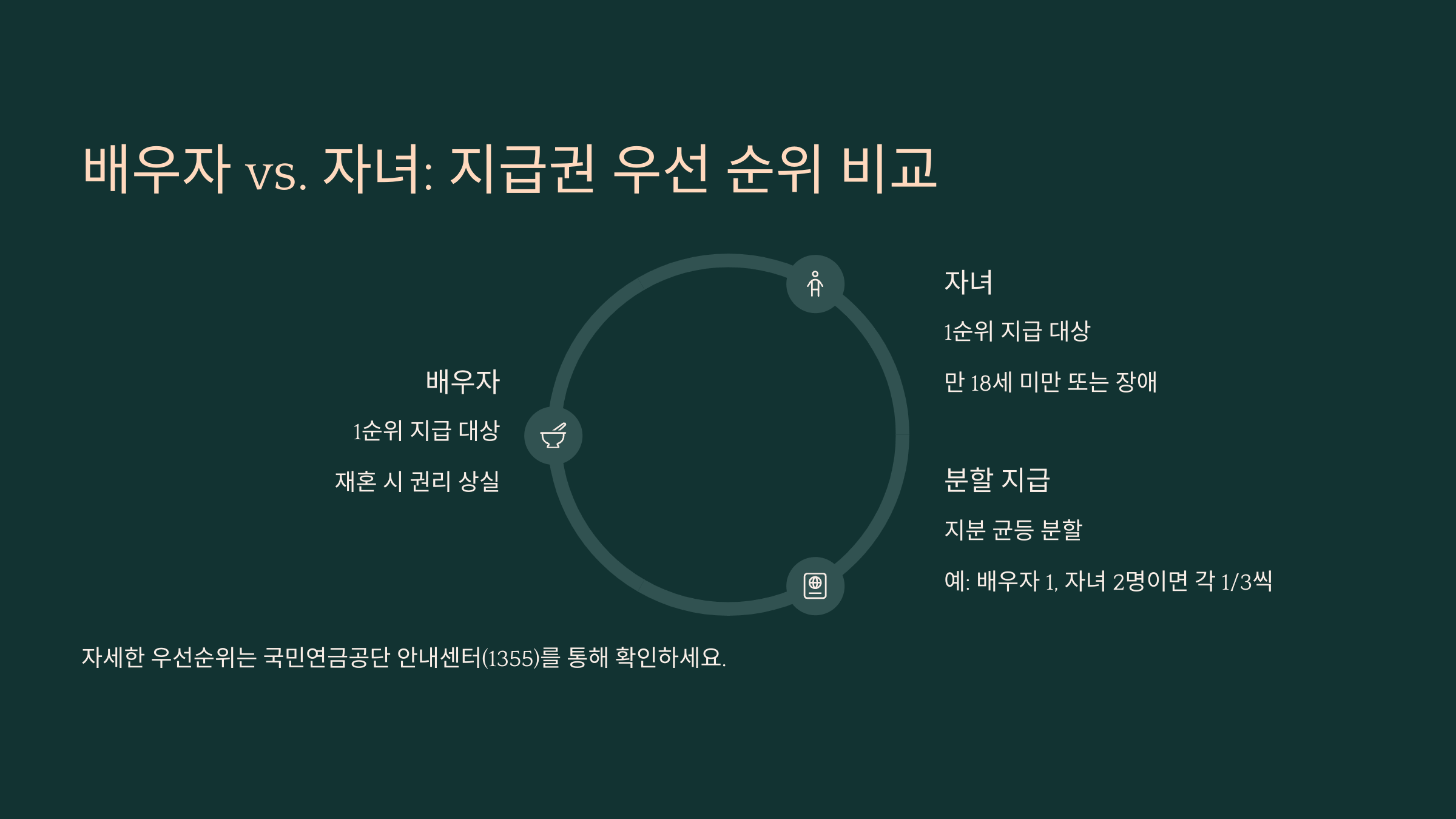 또한 배우자가 수급 요건을 갖추지 못했을 경우 자녀에게 지급되지만, 이때 자녀들 중 누구에게 지급할지도 조건이 따져져요. 모두가 수급 조건에 부합하면 균등하게 지급되며, 조건이 다른 경우에는 우선순위가 또 한 번 작동하게 되죠.