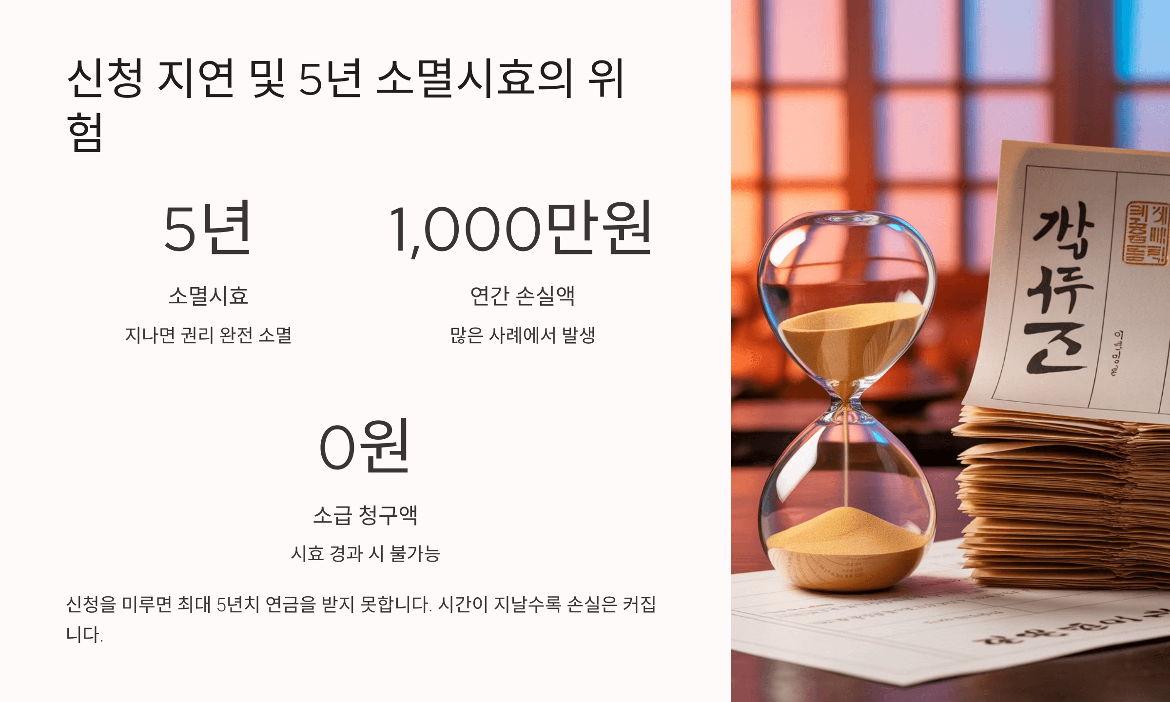 가장 큰 문제는 신청 지연으로 인한 ‘지급 소급 한도’예요. 유족연금은 원칙적으로 신청일 기준으로 소급해서 5년까지만 받을 수 있답니다. 즉, 사망일로부터 7년이 지나 신청한다면, 2년치 연금은 아예 받을 수 없게 되는 거죠.