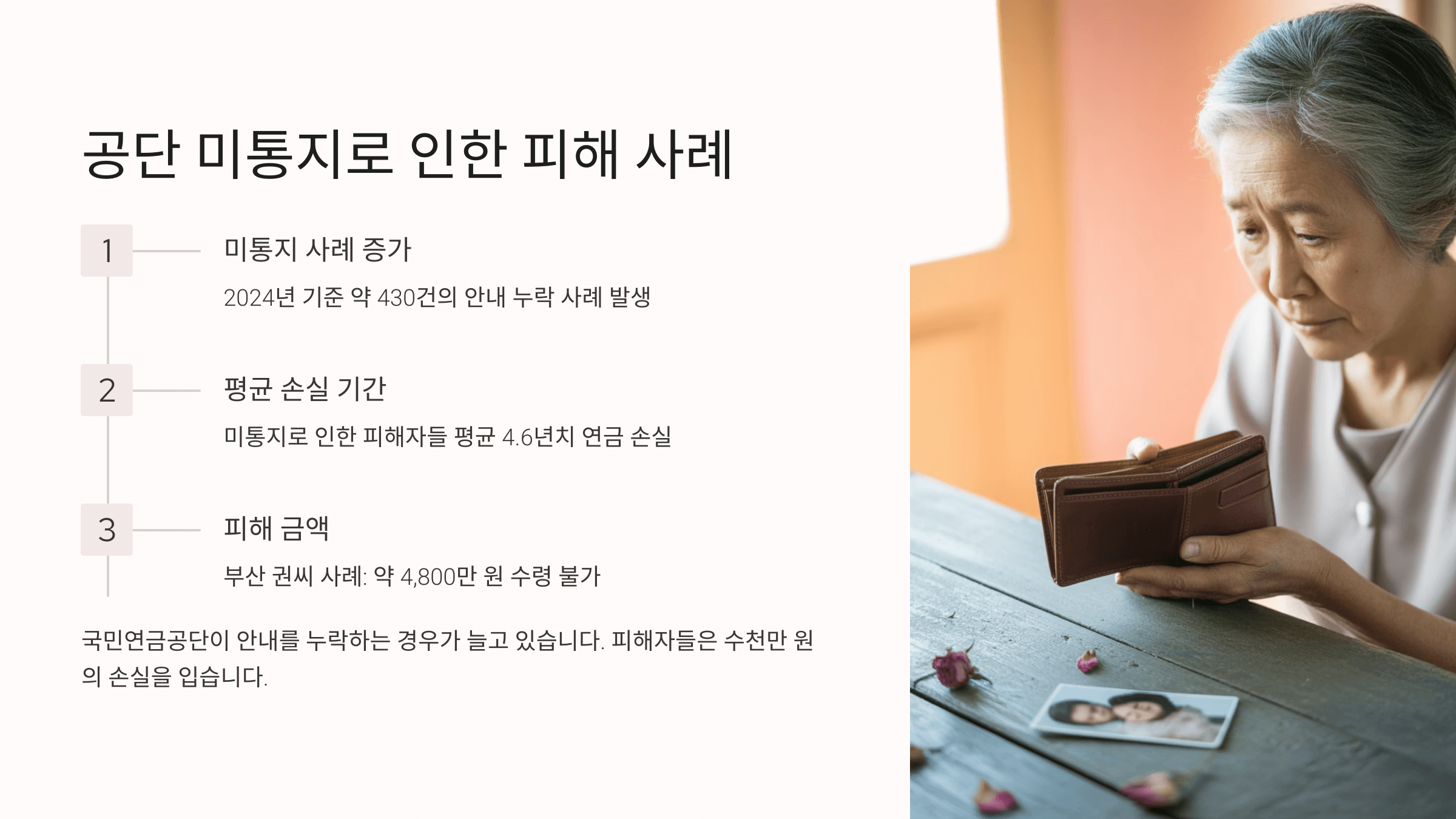 그런데 더 큰 문제는 공단이 적극적으로 이 사실을 알려주지 않는다는 거예요. 일부 유족들은 사망 신고가 됐는데도 연금 관련 안내를 전혀 받지 못했다고 말해요. 심지어 같은 주소에 살았는데도 별다른 우편이 오지 않은 경우도 있어요.