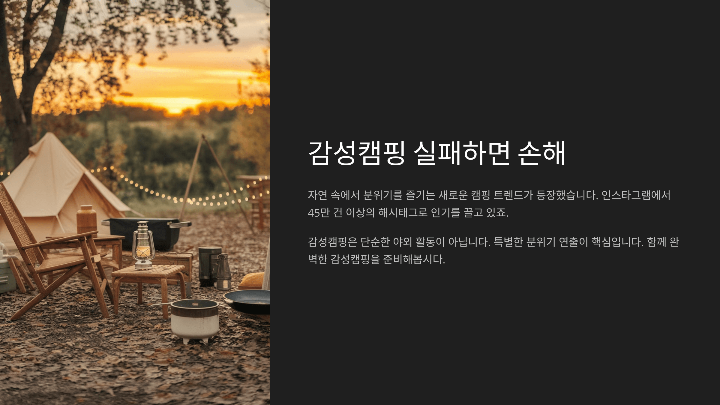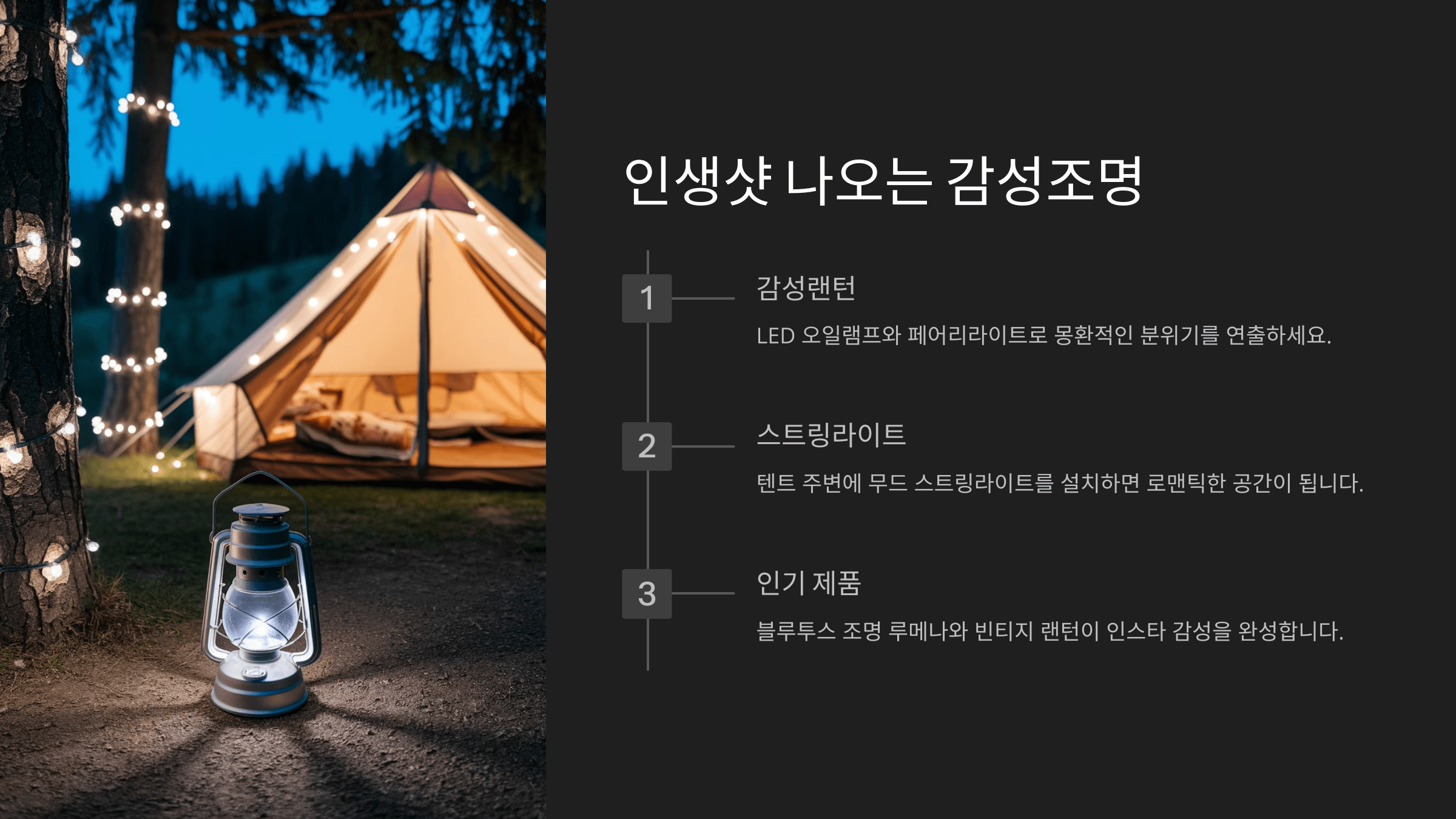 이제 기본적인 감성캠핑 장비들을 알아봤으니, 다음은 캠핑의 하이라이트! 감성샷을 완성해줄 조명에 대해 자세히 알아볼게요.📸