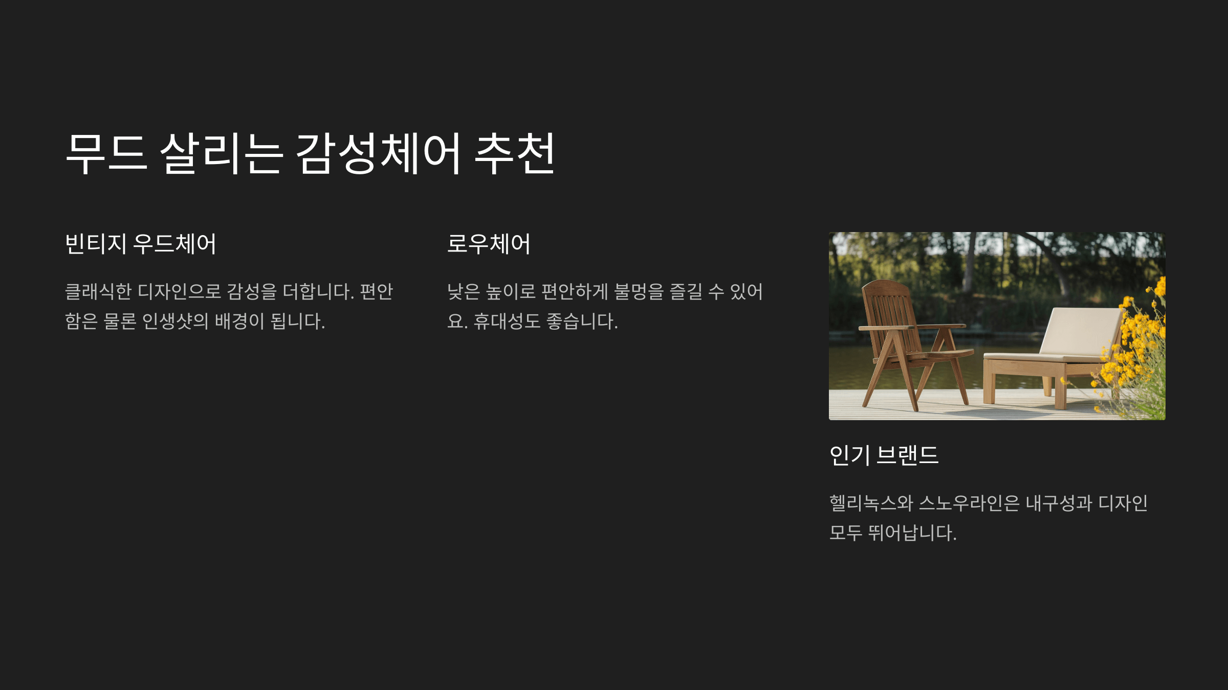 | 감성체어 | 휴식, 불멍용 | 우드 프레임, 천연 패브릭 |