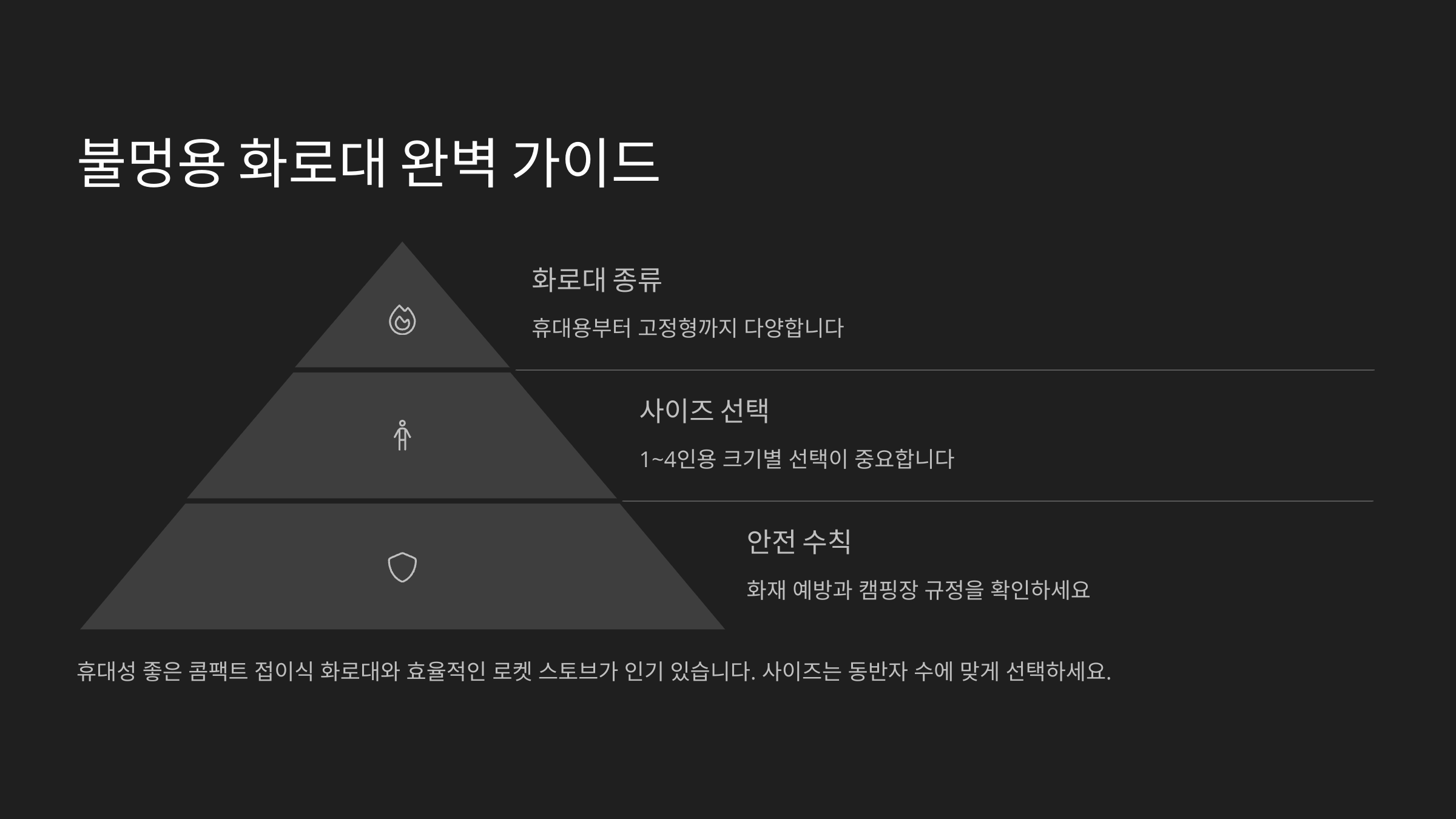 | 솔로스토브형 | 연기 적고 연소력 강함 | 불멍 최적화 | 감성캠핑, 불멍용 |
