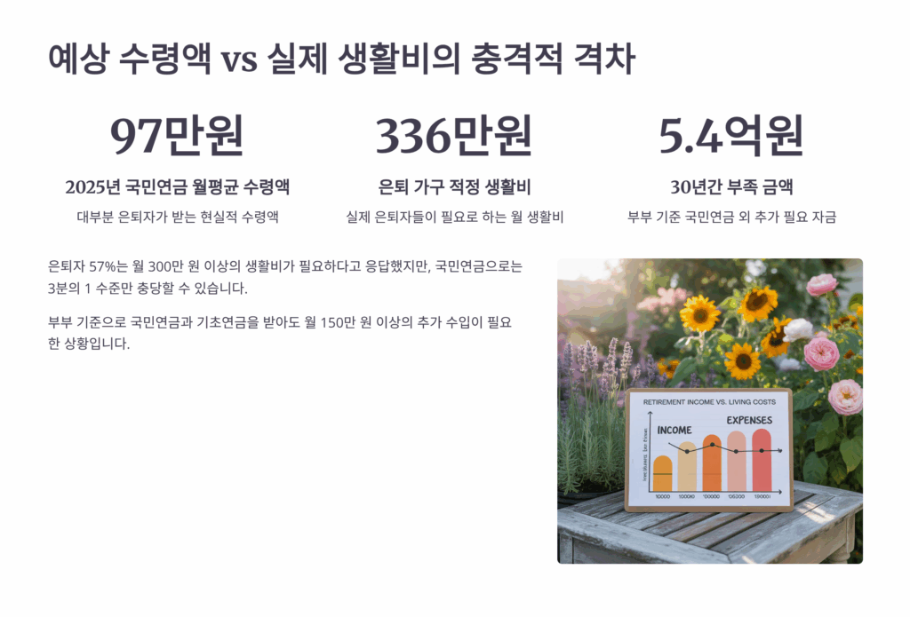 국민연금 예상 수령액과 실제 필요한 생활비 사이에는 상당한 격차가 존재해요. 2025년 1월 기준으로 국민연금 평균 수령액은 월 65만 8천원이에요. 20년 이상 가입한 완전노령연금 수급자도 평균 108만원 정도를 받고 있답니다. 하지만 통계청이 발표한 은퇴 후 최소 생활비는 1인 가구 기준 월 165만원, 부부 가구는 월 268만원이 필요하다고 해요.