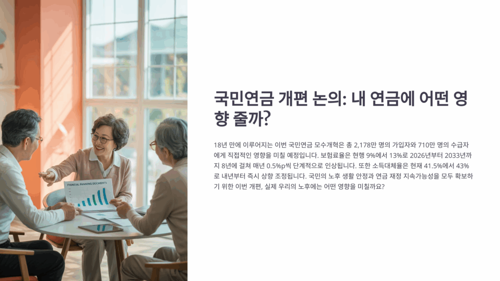 국민연금 개편 논의가 본격화되면서 많은 분들이 불안해하고 계세요. 2025년 현재, 정부는 국민연금의 지속가능성을 위해 다양한 개편안을 검토하고 있어요. 이번 개편이 우리의 노후 생활에 어떤 영향을 미칠지 구체적으로 살펴보겠습니다.
