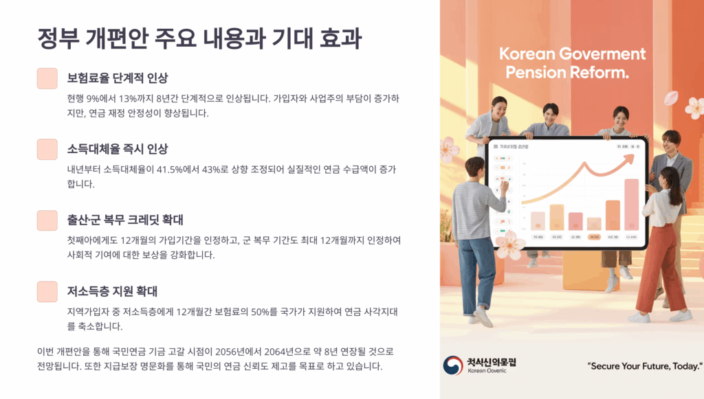 A6. 단기적으로는 부담이 늘어나지만, 장기적으로는 안정적인 연금 수령이 보장돼요. 개편 없이는 2055년 기금 소진으로 연금을 못 받을 수도 있어요. 또한 청년 세대를 위한 추가 크레딧, 저소득층 보험료 지원 등 보완책도 마련되고 있어요. 세대 간 연대를 통한 지속가능한 제도 구축이 목표예요.