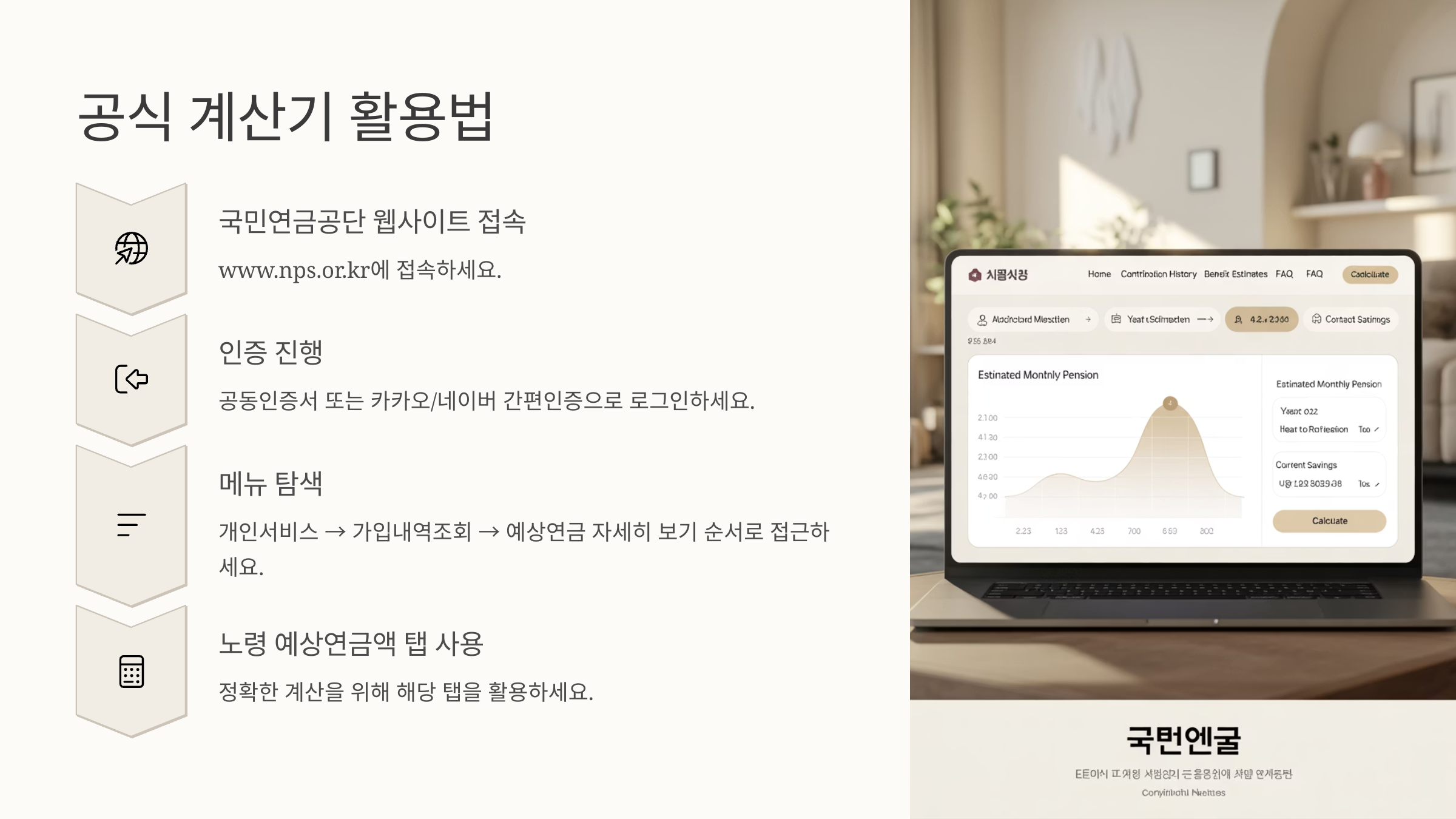 국민연금공단의 공식 홈페이지에는 ‘예상연금 모의계산’이라는 도구가 있어요. 로그인 없이도 이용 가능하고, 소득, 납부 기간 등을 입력하면 바로 예상 수령액을 확인할 수 있어요. 사용법도 꽤 직관적이라 초보자도 어렵지 않게 이용할 수 있답니다.