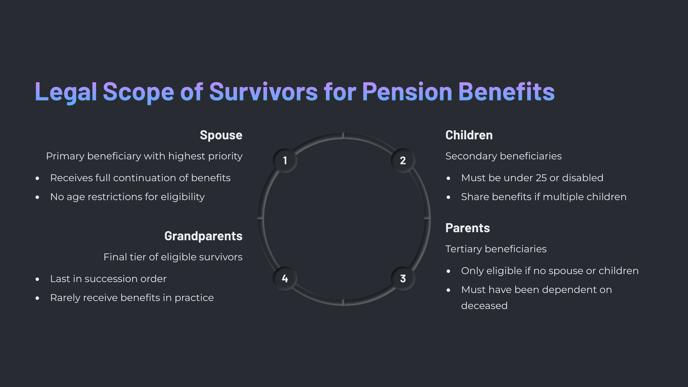 국민연금에서 유족연금을 받을 수 있는 사람은 국민연금법 제67조에서 명확히 정해져 있어요. 해당 법에 따르면 수급 대상자는 다음과 같은 순위로 규정돼 있어요. ① 배우자, ② 25세 미만 또는 장애가 있는 자녀, ③ 60세 이상 또는 장애가 있는 부모, ④ 손자녀 및 조부모 순으로 지정돼 있죠.