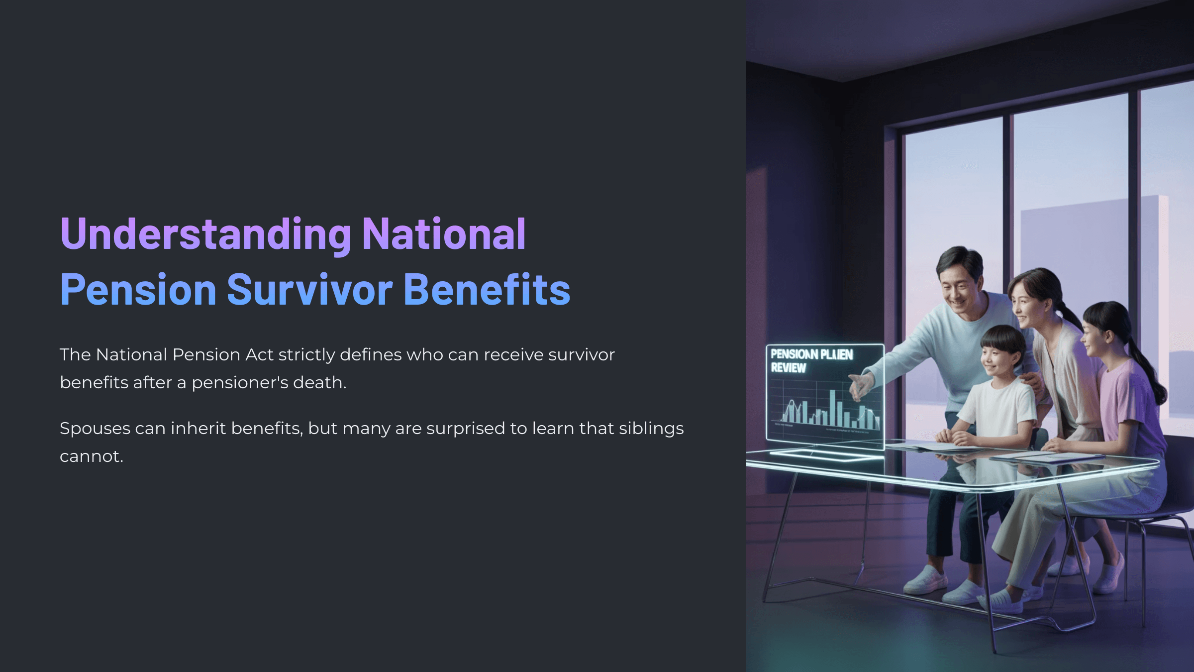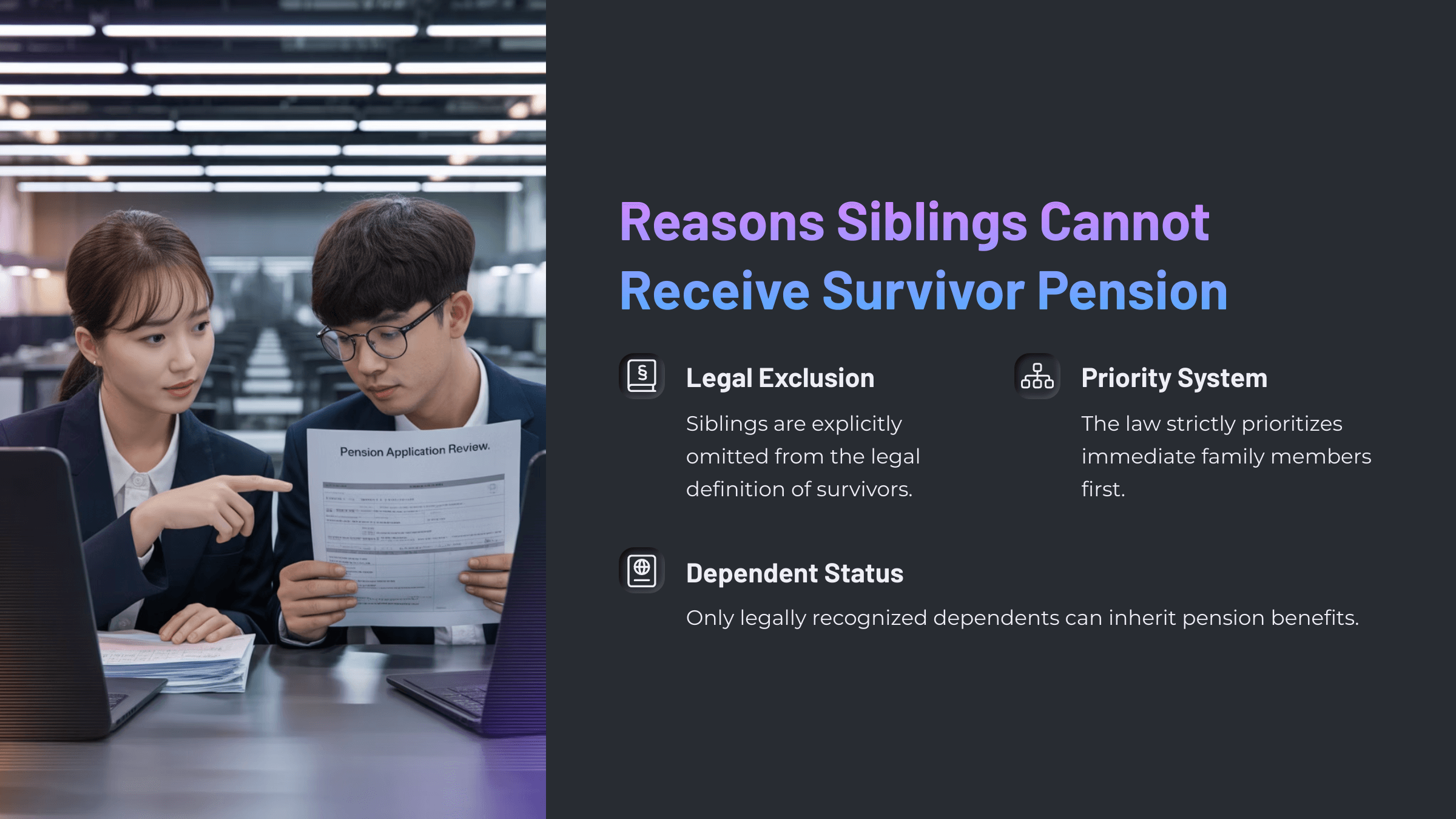 즉, 형제자매가 아무리 실질적으로 부양을 받았거나 간병까지 했더라도, 법률상 ‘유족’으로 규정되지 않으면 연금 수급은 불가능하다는 거예요. 이 점이 많은 사람들의 감정과 상충하는 부분이죠.