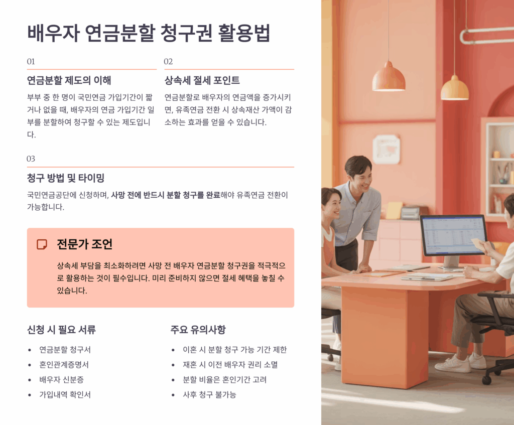 황혼이혼이 증가하는 요즘, 연금분할은 노후 생활비 확보와 동시에 상속세 절세까지 가능한 일석이조의 방법이에요. 특히 고소득자 배우자를 둔 경우, 분할받은 연금액이 상당할 수 있는데 이 모든 금액이 상속세 과세대상에서 제외된다는 점이 매력적이죠! 🎯