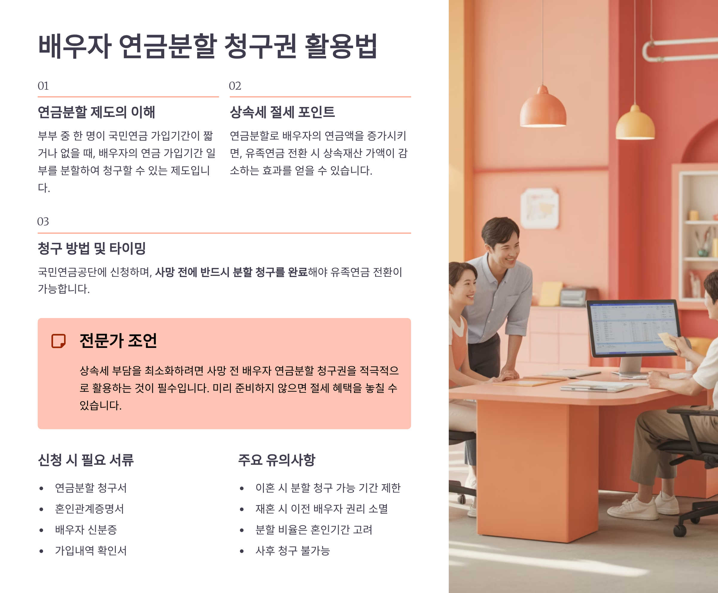 배우자 연금분할 청구권은 이혼 시 혼인기간 중 형성된 연금수급권을 분할받을 수 있는 제도인데요, 이것도 상속세 절세에 활용할 수 있어요! 혼인기간이 5년 이상인 경우, 그 기간 동안의 연금가입기간을 균등하게 분할받을 수 있답니다. 이렇게 분할받은 연금수급권 역시 상속재산에서 제외되기 때문에 절세 효과가 크죠.