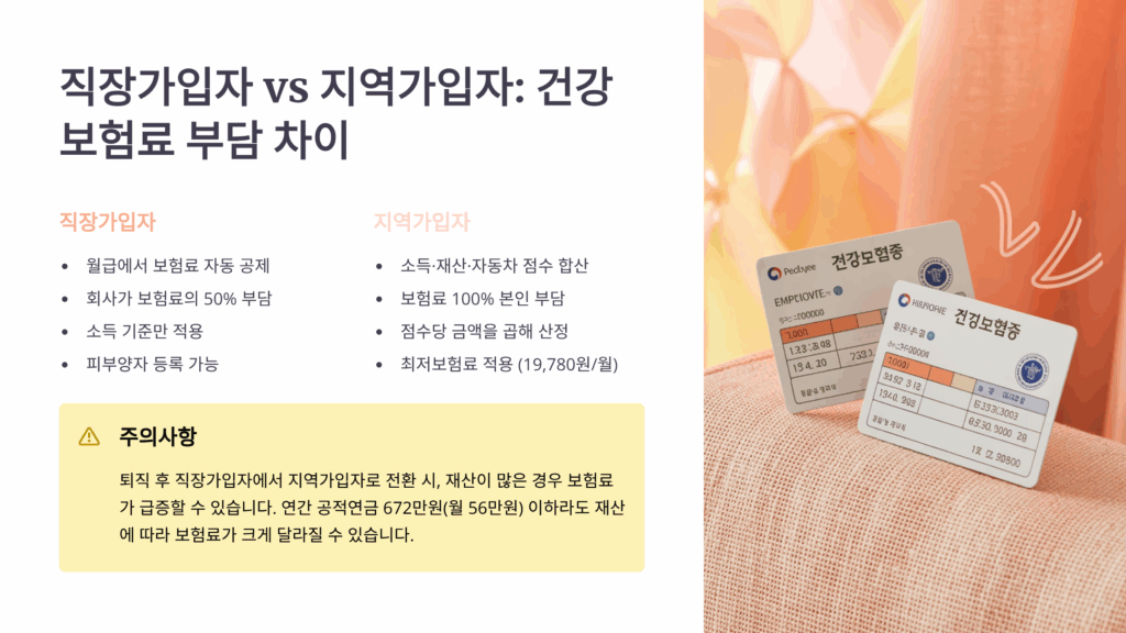 재산 보험료도 차이가 나요. 직장가입자는 아무리 재산이 많아도 소득에 대해서만 보험료를 내지만, 지역가입자는 집, 자동차 등 재산에 대해서도 보험료를 내야 해요. 서울에 아파트 하나만 있어도 재산보험료가 상당할 수 있죠.