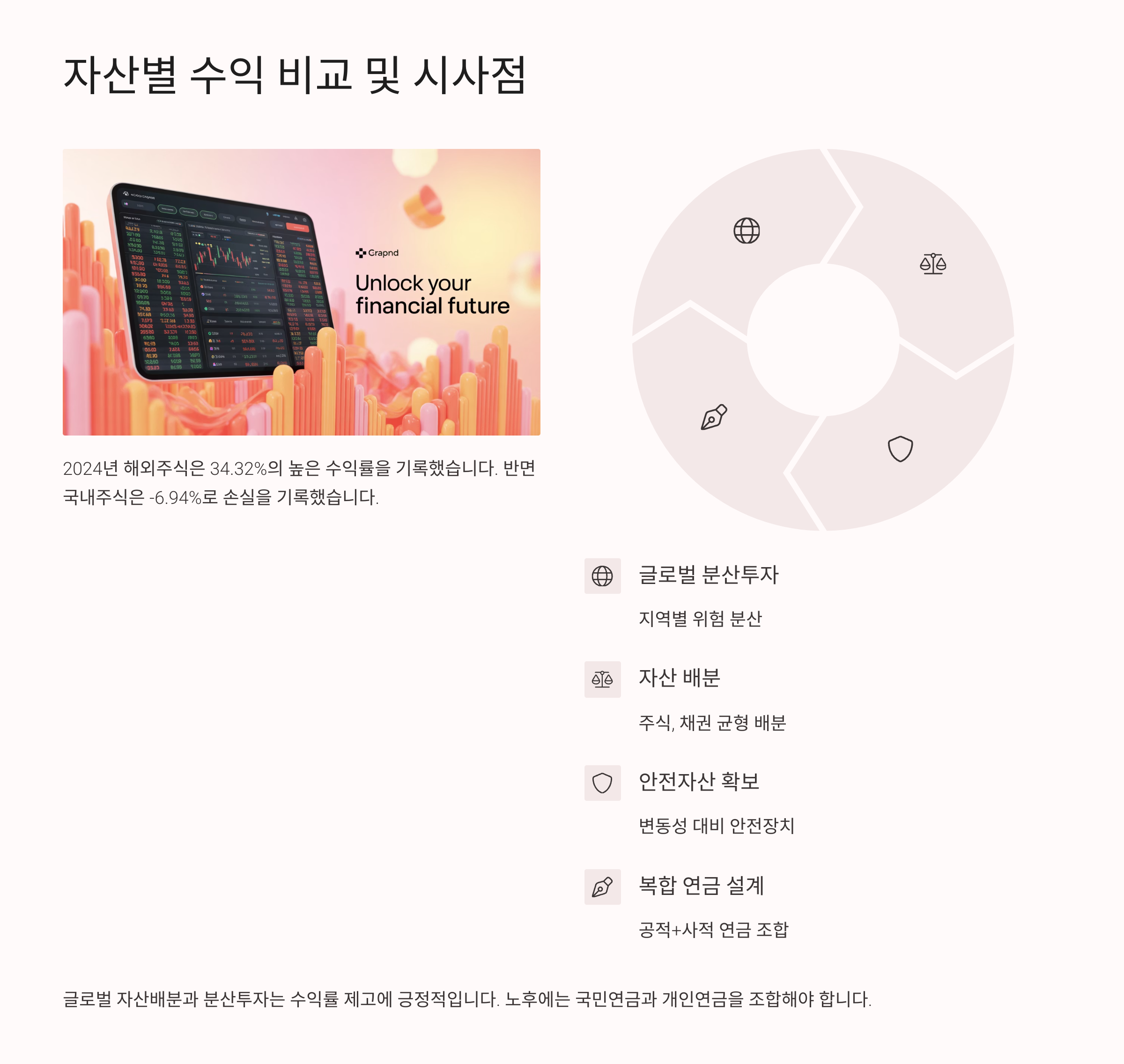 | 자산군 | 비중(%) | 2023년 수익률 | 5년 평균 수익률 |
