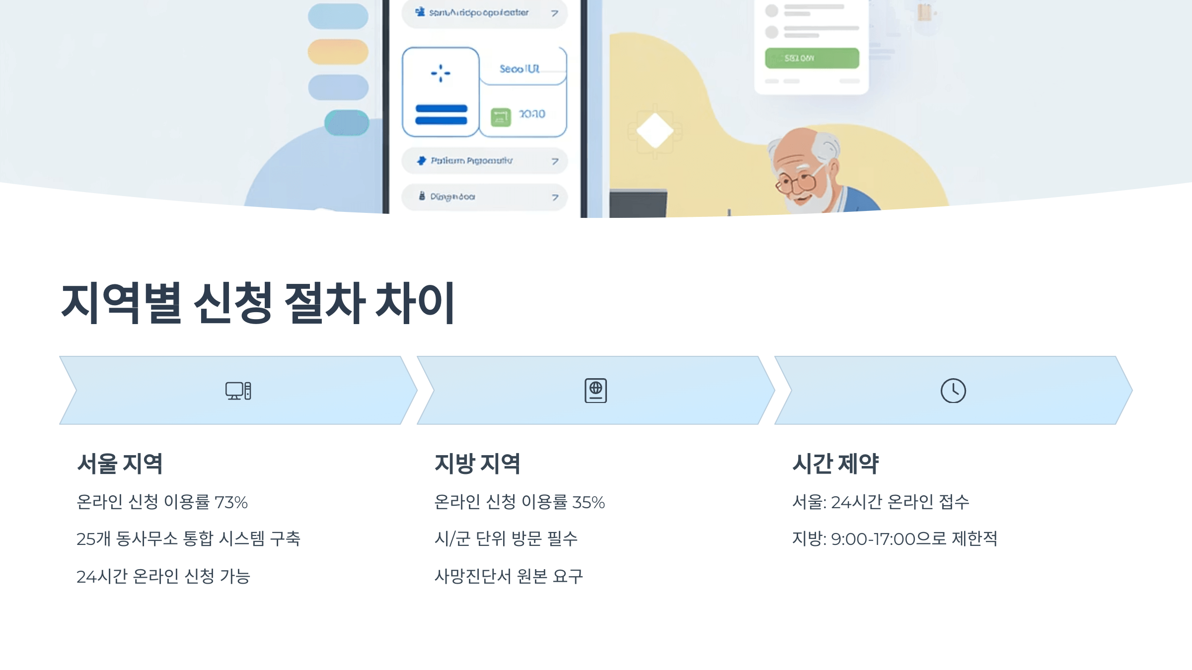 A1. 신청 방식은 동일하지만, 서울은 전자접수와 전문 상담 시스템이 더 잘 갖춰져 있고, 지방은 현장접수 중심이 많아 실질적인 경험에는 차이가 있어요.