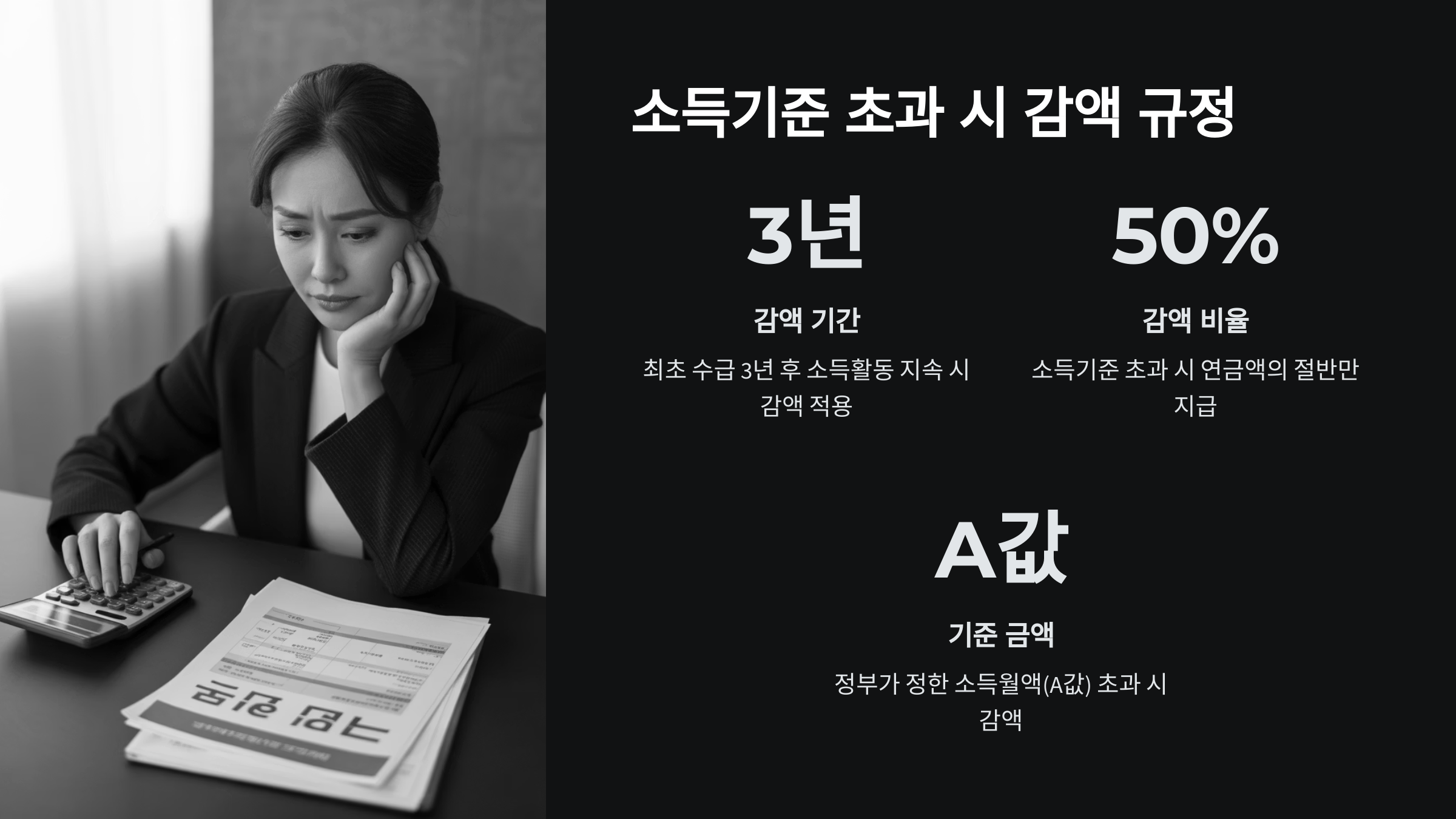 A3. 아니에요! 1원이라도 기준을 넘으면 바로 1/3이 감액되는 구조예요. 예를 들어 월평균소득이 223만 6천 원이면 기준을 1천 원 초과한 것이지만, 연금의 1/3이 바로 감액돼요. 따라서 기준선 근처라면 소득 조정을 고려해 볼 필요가 있어요.