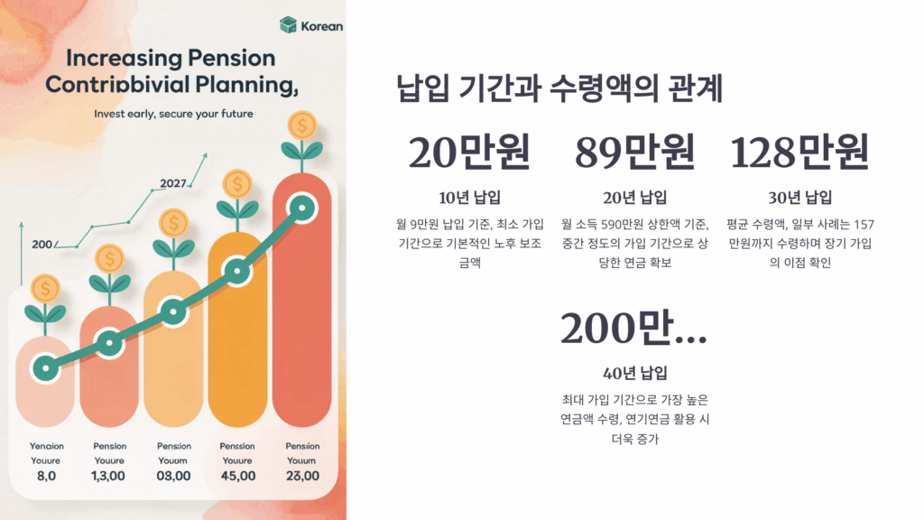 납입 기간별로 살펴보면 20년 가입 시 32%, 30년 가입 시 41%, 40년 가입 시 50%의 소득대체율을 적용받아요. 이는 2028년까지 단계적으로 40%까지 낮아질 예정이지만, 현재 가입자들은 더 유리한 조건을 적용받고 있답니다. 가입 기간이 1년 늘어날 때마다 연금액이 약 5~7% 증가하는 효과가 있어요.