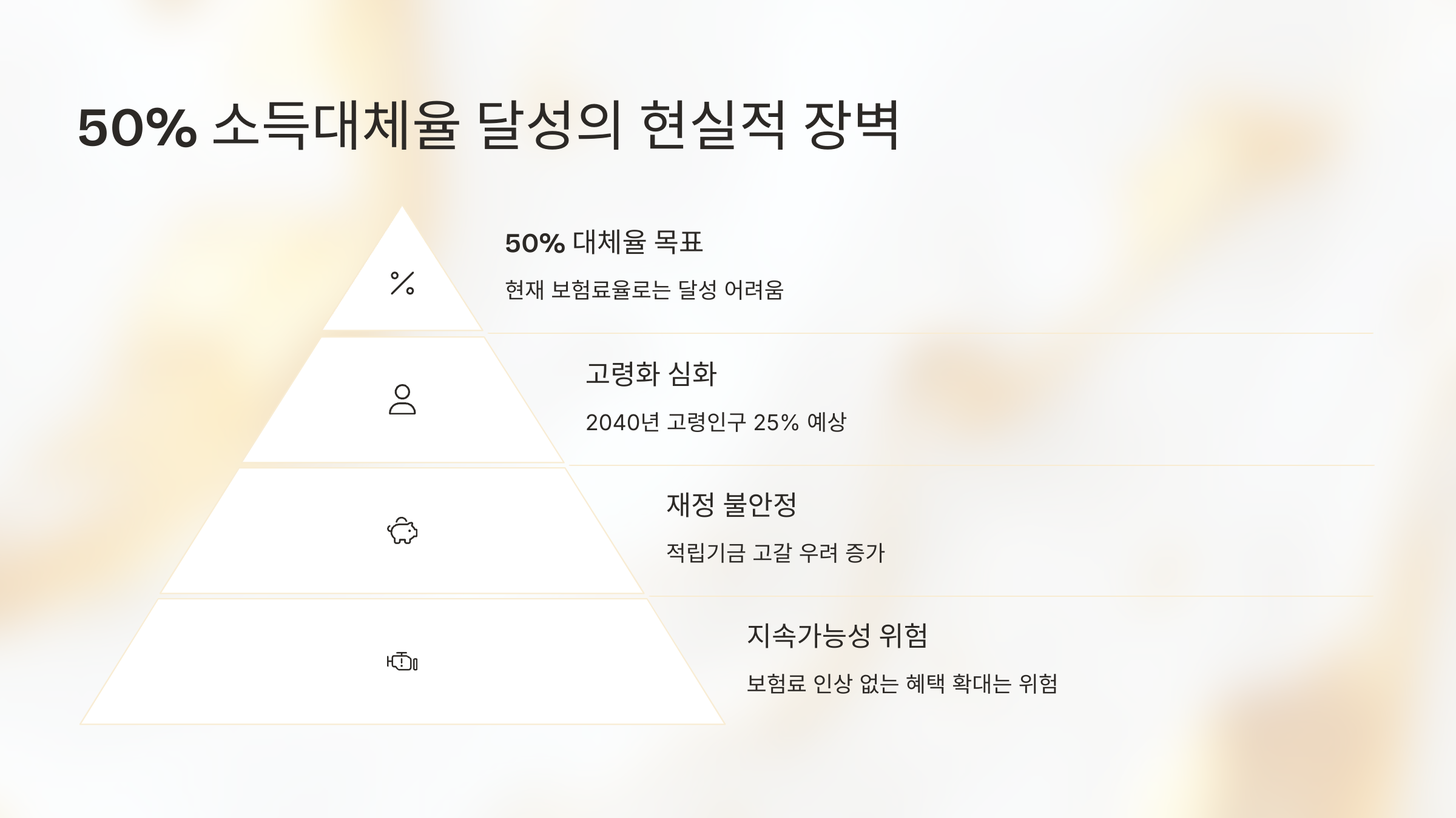 이런 상황에서 소득대체율을 높인다는 건 결국 더 많은 재정을 투입하거나 보험료를 인상해야 한다는 뜻이에요. 하지만 정치적인 부담이 커서 정부나 국회 모두 쉽게 결정을 내리기는 어려운 구조예요.