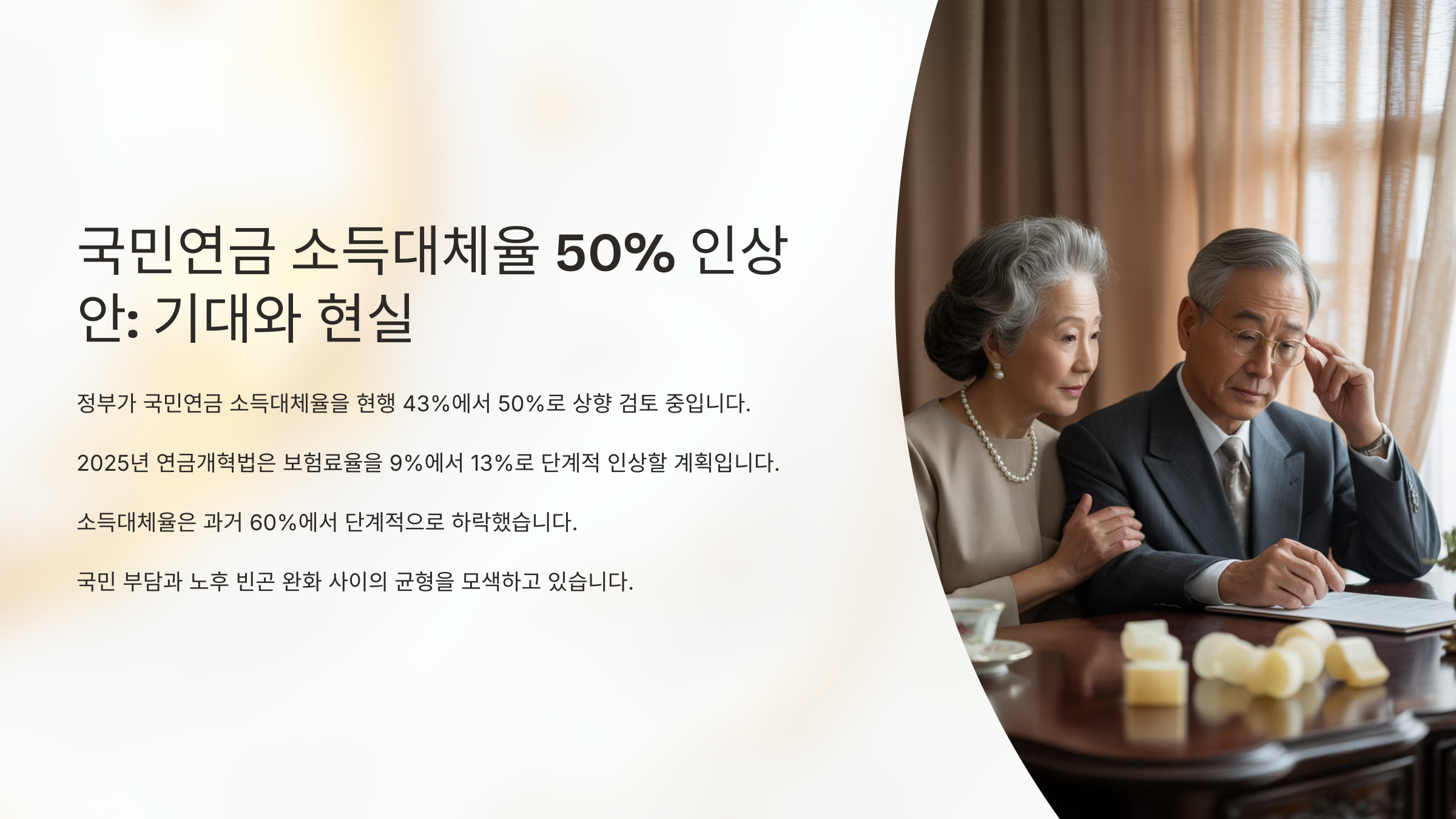 정부는 최근 국민연금 개편을 논의하면서 ‘소득대체율 50%’라는 목표를 제시했어요. 소득대체율이란 은퇴 후 연금으로 받는 금액이 현역 시절 소득의 몇 퍼센트인지 나타내는 수치예요. 현재는 약 40% 수준이지만, 많은 국민이 이것만으론 부족하다고 느끼고 있어요.