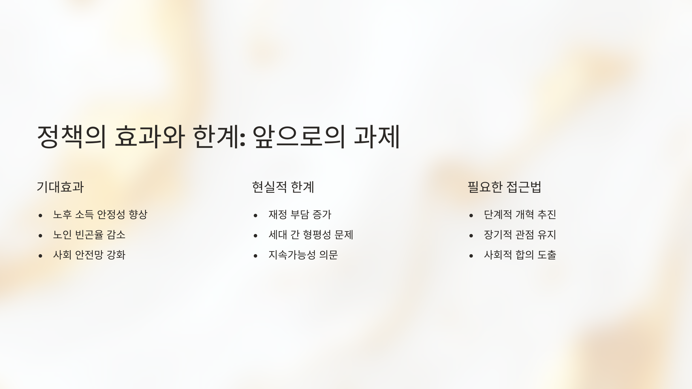 | 노후 소득 보장 | 빈곤율 감소 | 저소득층 혜택 제한 |