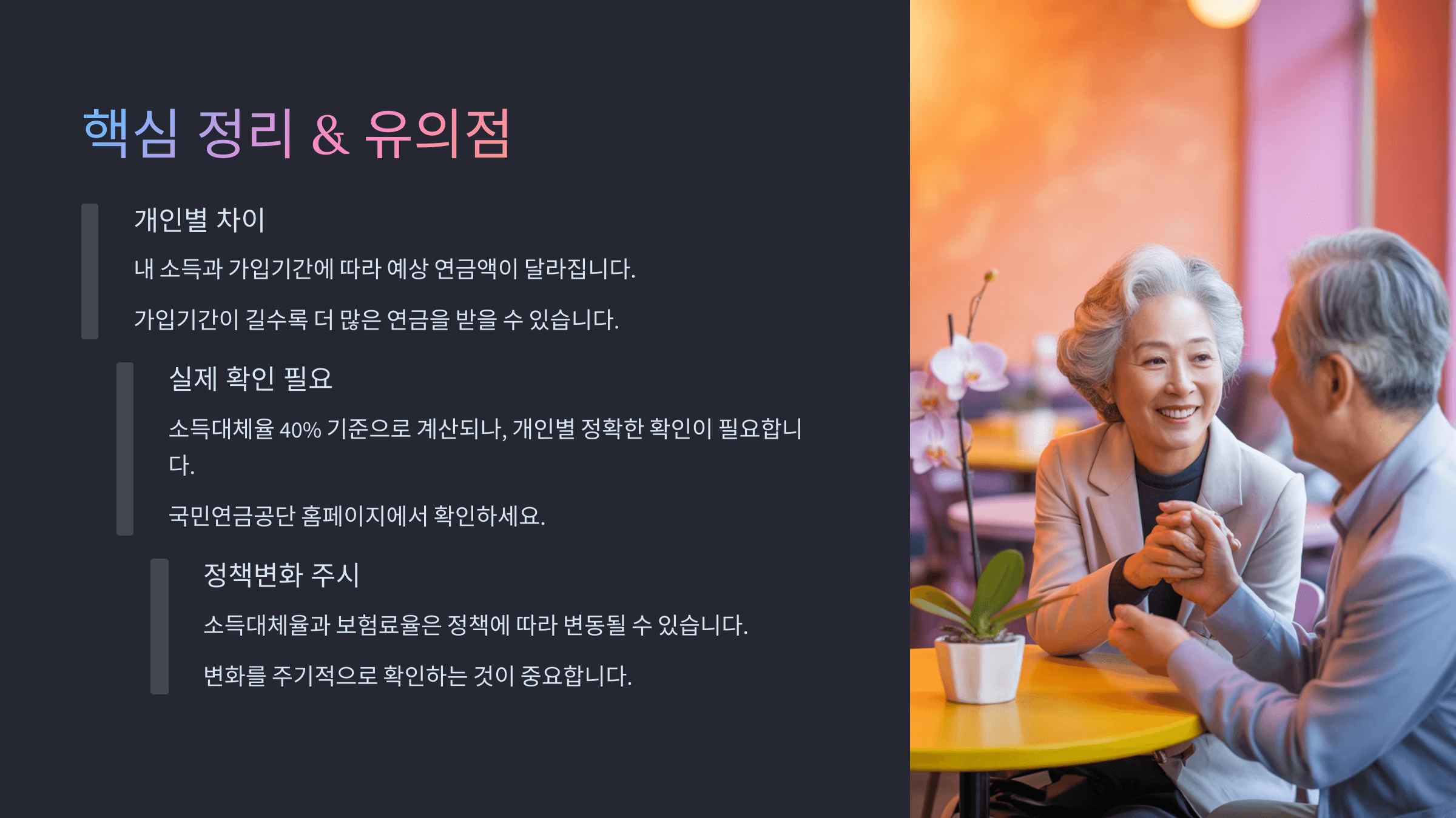 결론적으로, 단순히 월급 많이 벌었다고 연금도 많이 받는 구조는 아니에요. 소득대체율이 조정되기 때문에 소득이 높을수록 실수령 비율은 줄어드는 특징이 있어요. 이를 이해하고 계획을 세우는 게 국민연금의 핵심이에요.