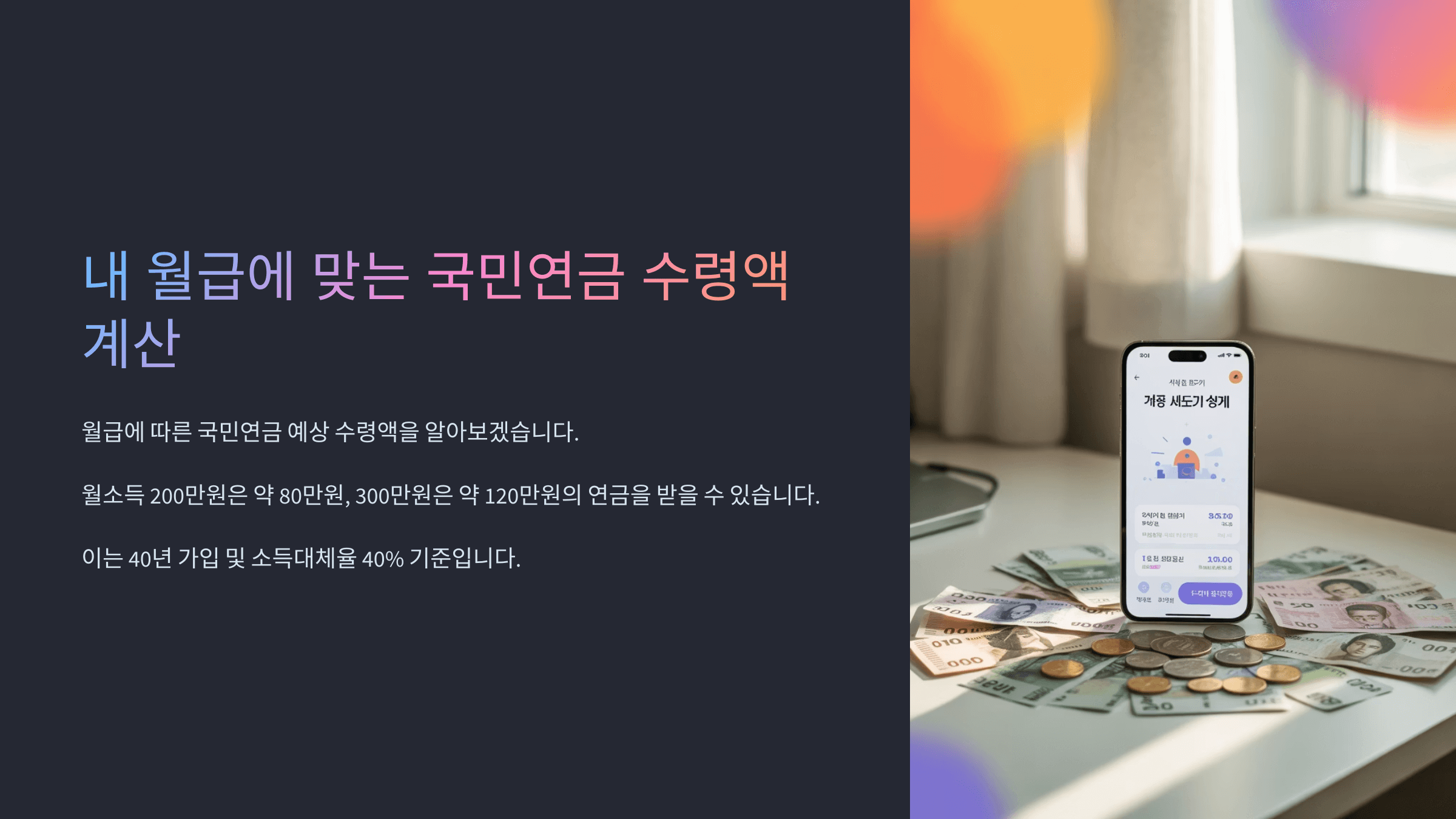 가령 월급이 300만 원인 직장인의 경우, 매달 27만 원이 국민연금으로 빠져나가고, 이 중 13만5천 원은 본인이 내게 되죠. 그런데 20년 이상 성실히 납입하면 연금 수령액은 훨씬 높아져요. 연평균 소득과 가입기간이 핵심이에요.