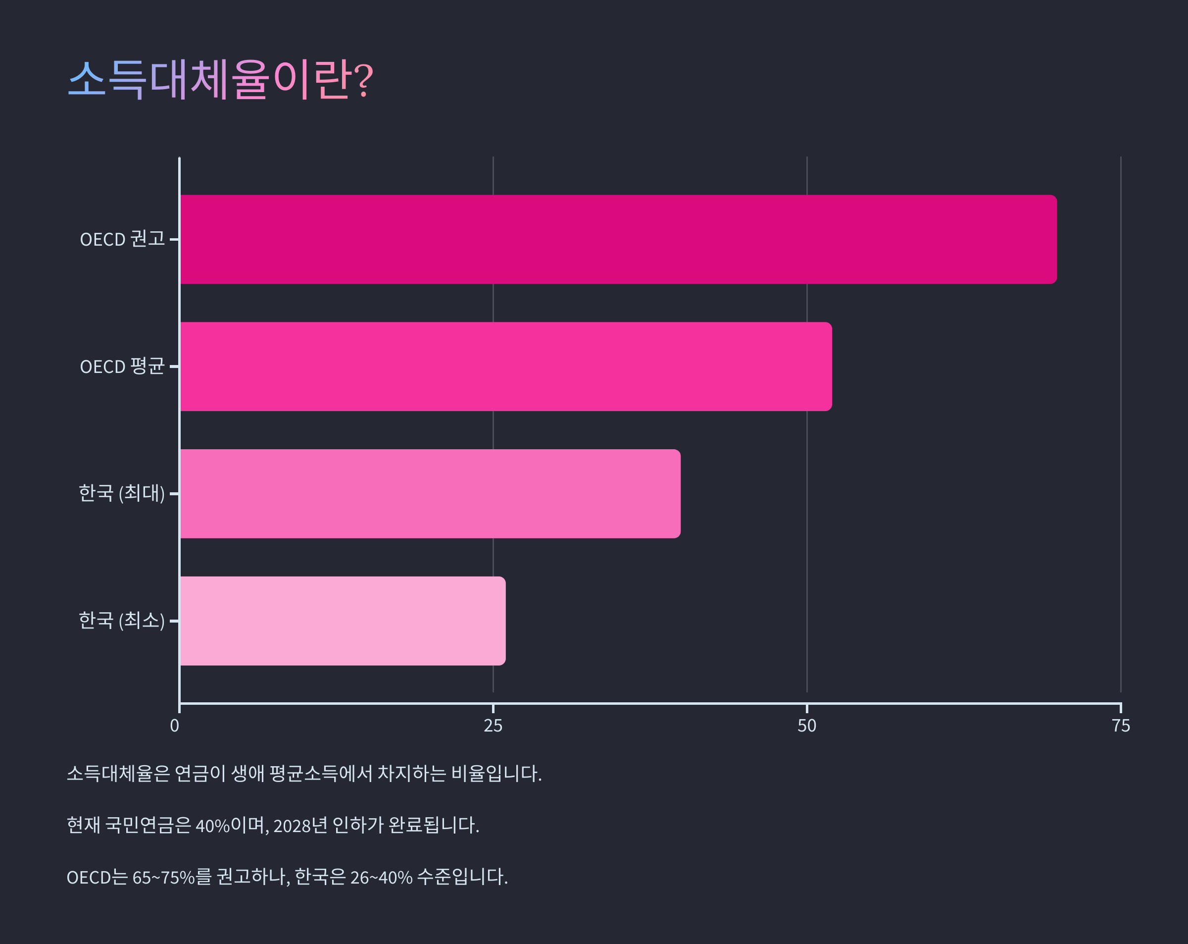 소득대체율이란 쉽게 말해, 은퇴 후 국민연금으로 받는 금액이 퇴직 전 소득의 몇 퍼센트를 차지하는지를 의미해요. 예를 들어 은퇴 전 월급이 300만 원인데 연금으로 90만 원을 받는다면 소득대체율은 30%예요. 이 비율이 높을수록 은퇴 후 생활 안정에 유리하겠죠?