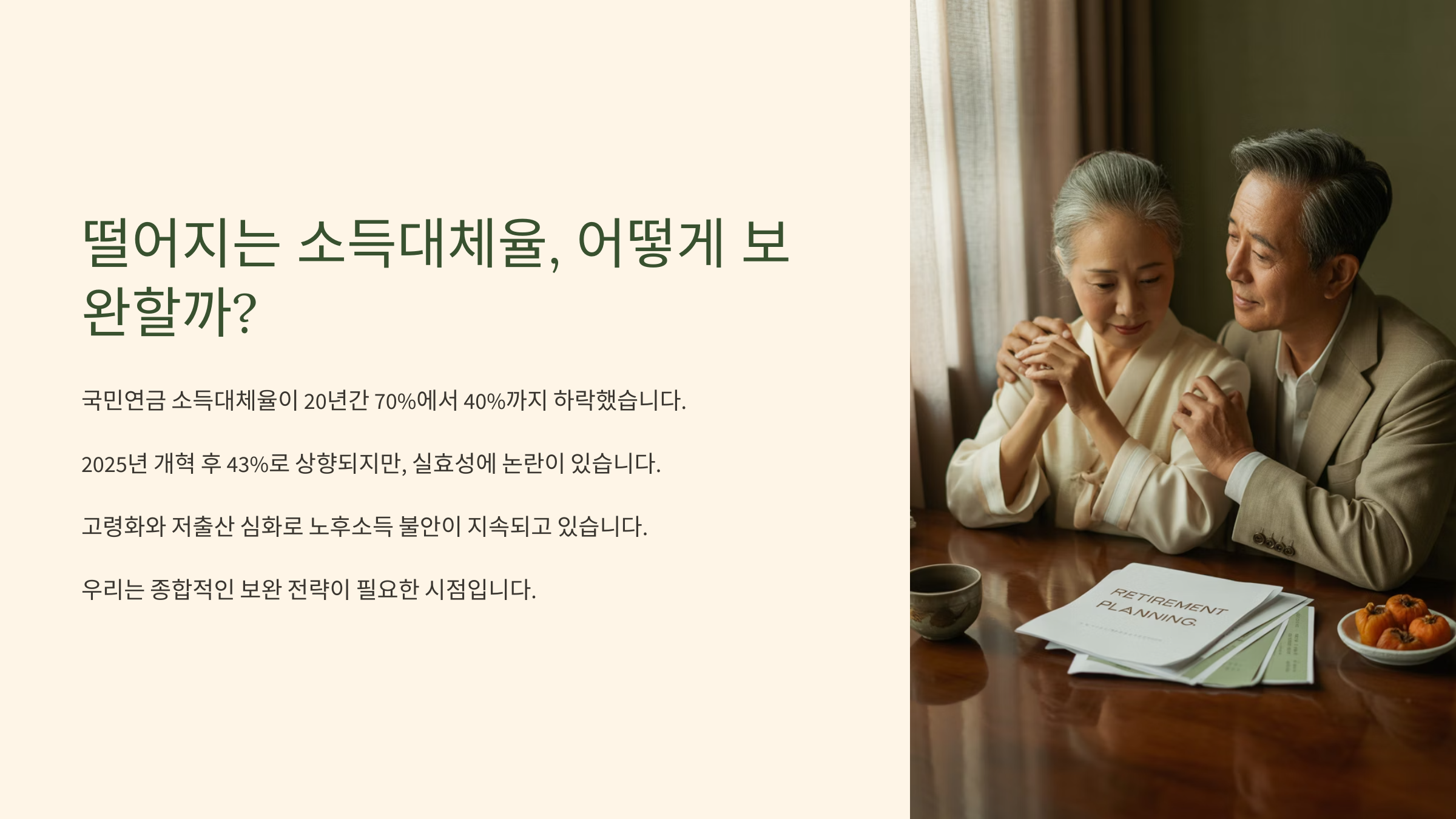 국민연금의 소득대체율이 지속적으로 하락하면서 은퇴 후 생활비 확보에 대한 우려가 커지고 있어요. 현재 국민연금만으로는 은퇴 전 소득의 40% 수준밖에 보장받을 수 없어 추가적인 노후 대비책이 절실한 상황이랍니다. 특히 인플레이션과 수명 연장으로 인해 더 많은 노후 자금이 필요해지고 있어요. 이런 상황에서 개인연금, 퇴직연금, 투자 등을 통한 다층적 노후 준비가 필수가 되었답니다.