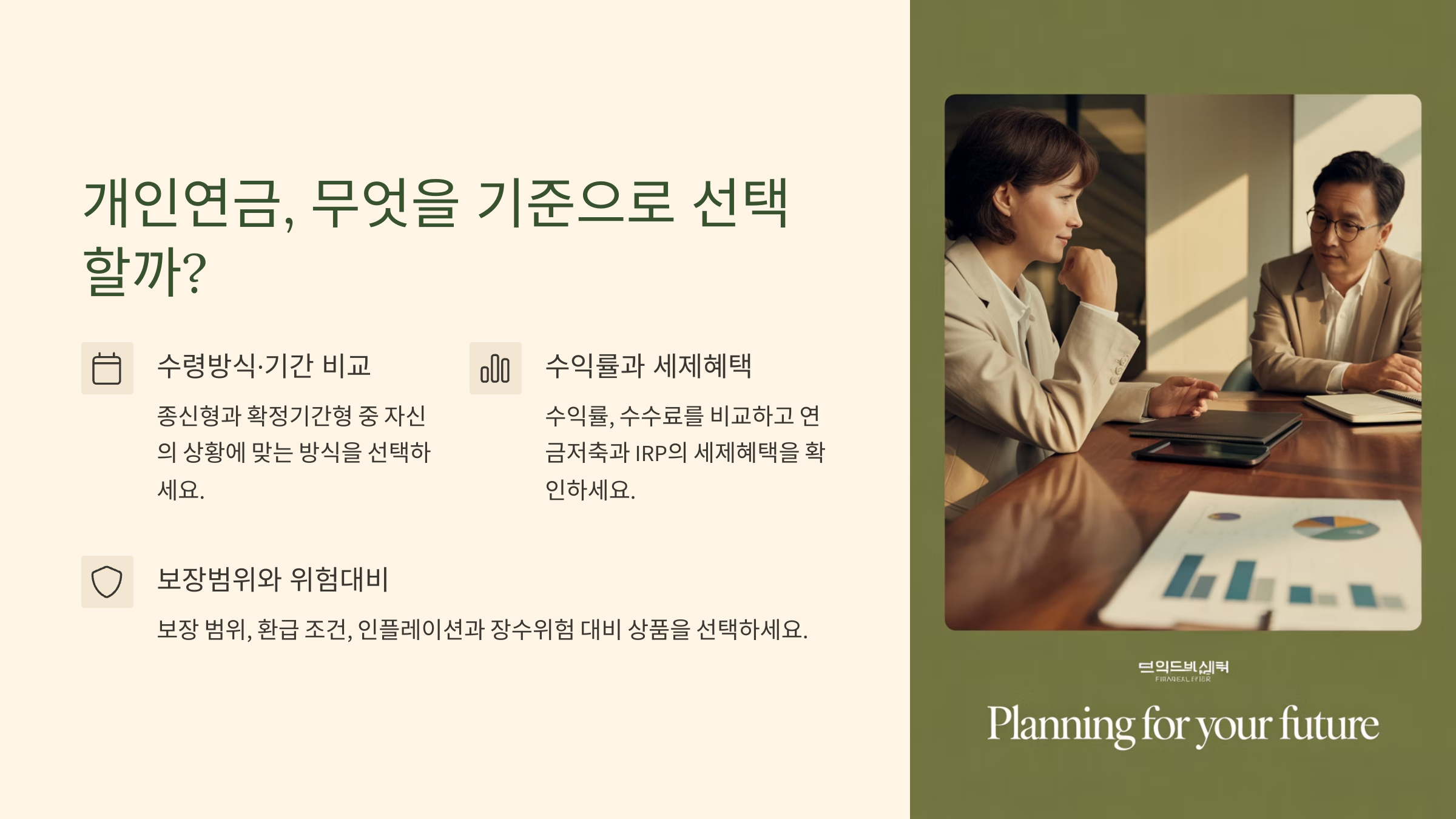 개인연금 상품을 선택할 때는 먼저 본인의 위험 성향을 파악해야 해요. 공격적 투자를 선호한다면 주식형 펀드 비중이 높은 연금저축이 적합하고, 안정성을 중시한다면 채권형이나 연금보험을 고려해보세요. 나이가 젊을수록 주식 비중을 높이고, 은퇴가 가까워질수록 안전 자산 비중을 늘리는 것이 일반적인 전략이에요. 또한 수수료 구조도 중요한 선택 기준이 되는데, 운용보수가 낮은 상품일수록 장기 수익률에 유리하답니다.
