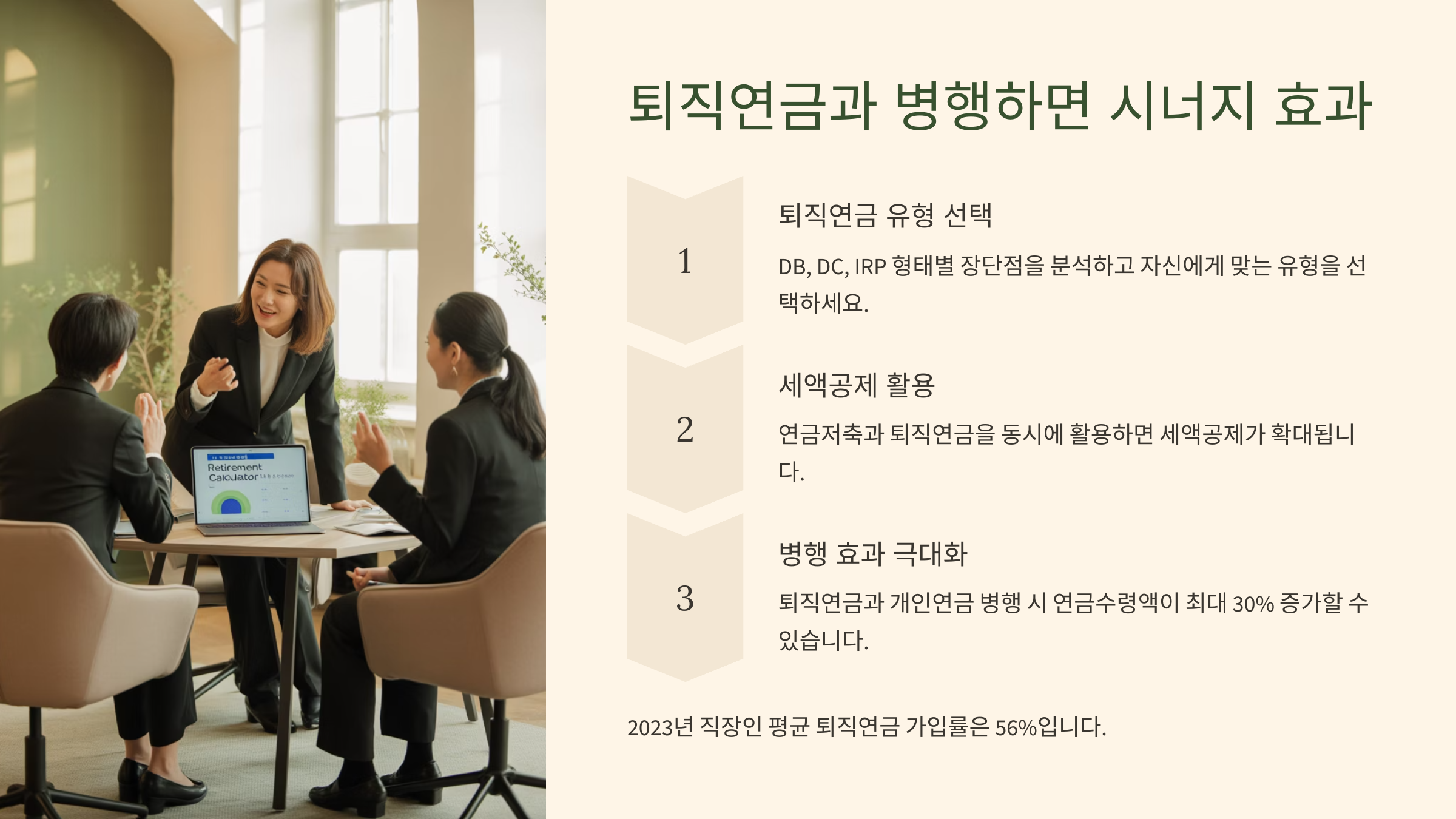 A2. 회사에서 퇴직연금을 제공한다면 퇴직연금을 먼저 활용하고, 추가로 개인연금에 가입하는 것이 좋아요. 퇴직연금은 회사 지원금이 있어 더 유리하고, 개인연금은 세액공제 혜택을 받을 수 있답니다.