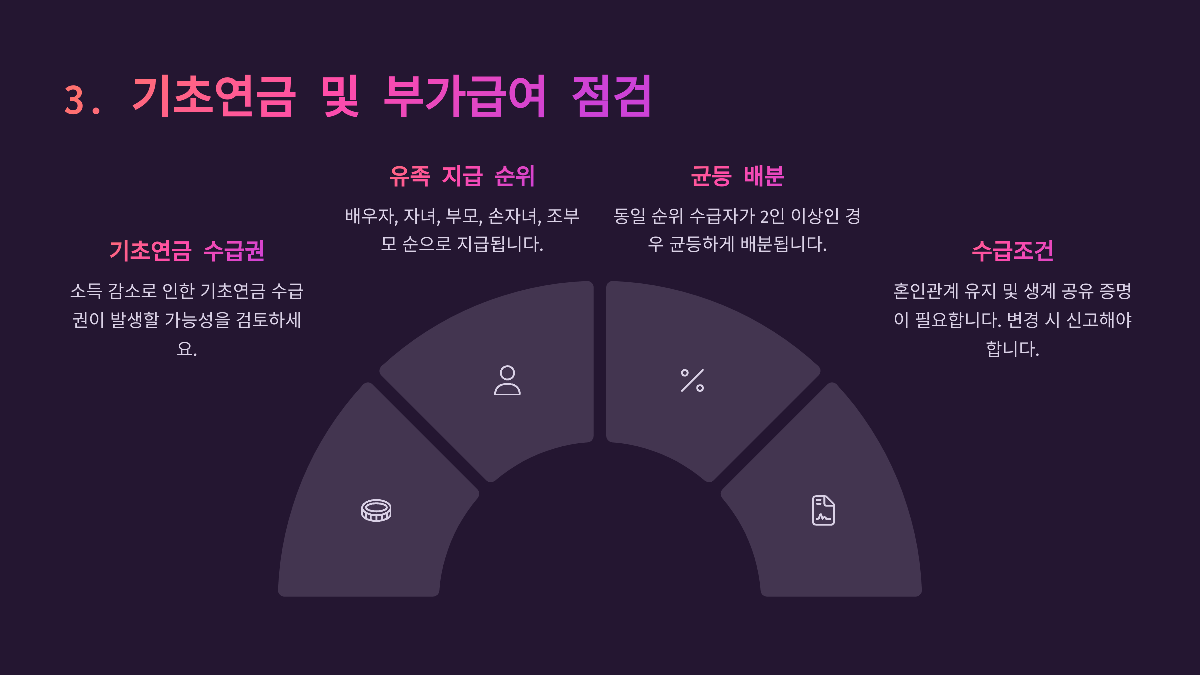 배우자가 사망한 이후, 고인이 기초연금을 받고 있었는지 확인하는 것도 아주 중요해요. 기초연금은 65세 이상이며 소득 및 재산이 일정 기준 이하일 경우 지급되는 급여로, 고인이 수급자였다면 사망 시점에 따라 일부 혜택이 유족에게 연결될 수 있어요.