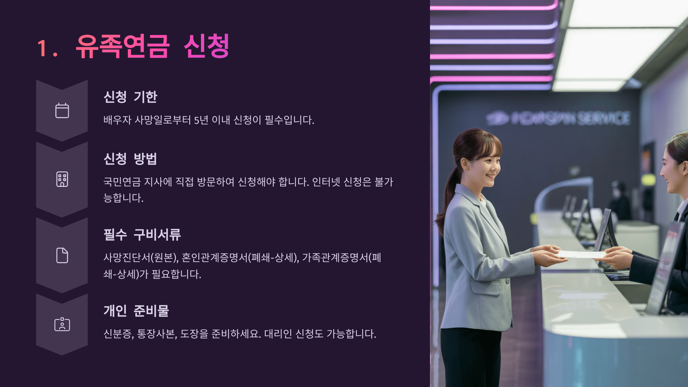 유족연금은 한 번 신청하면 평생 받을 수 있는 중요한 급여라서, 누락 없이 서류를 준비하고 공단과 상담 후 접수하는 게 안전해요. 연금 수급자였는지, 가입 중이었는지는 공단에 조회를 요청하면 바로 확인 가능하니 걱정 마세요.