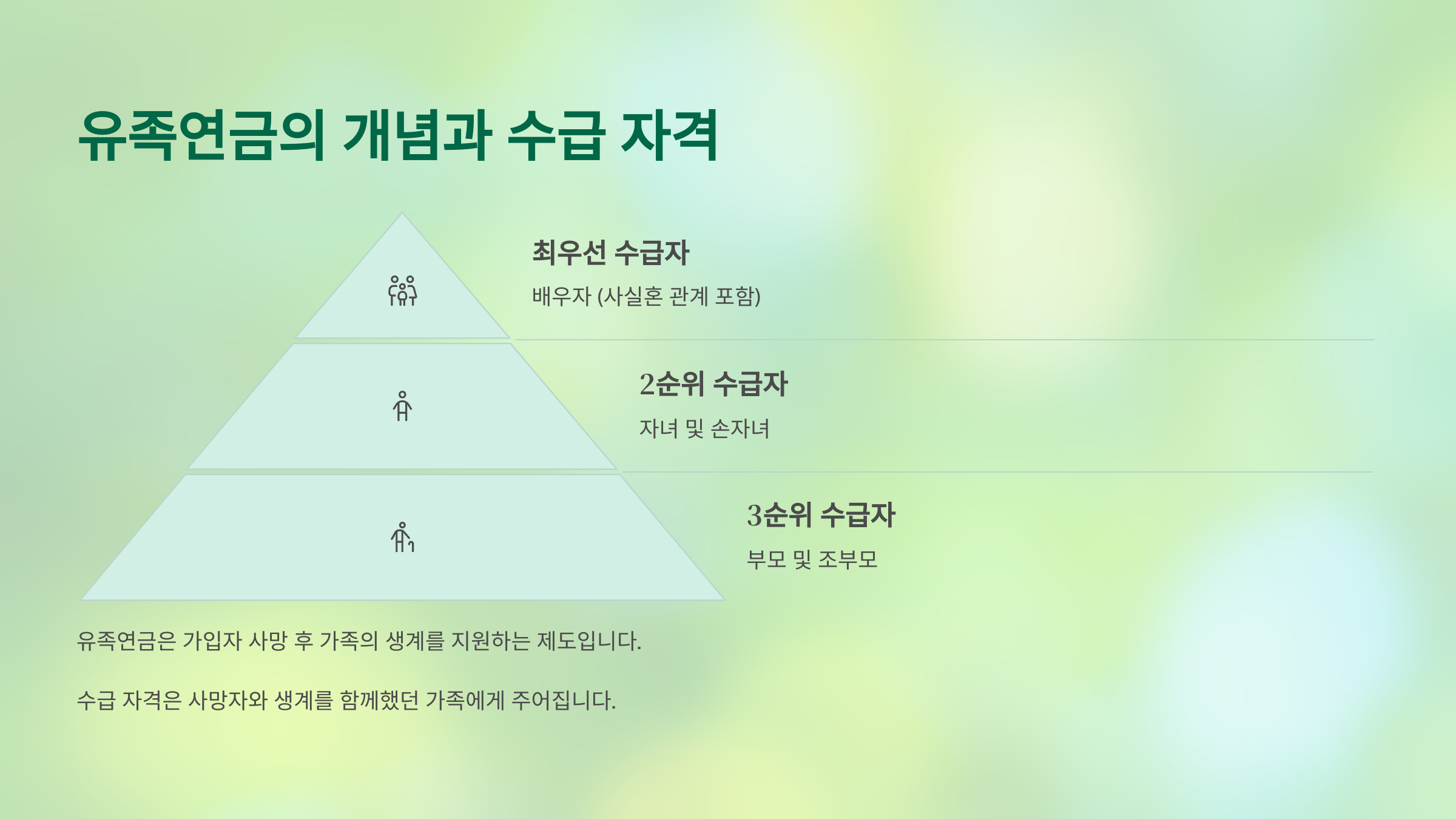 유족의 범위는 법적으로 명확하게 정해져 있어요. 배우자, 자녀, 부모, 조부모, 손자녀가 포함되는데, 이 중에서도 우선순위가 있답니다. 1순위는 배우자와 자녀, 2순위는 부모, 3순위는 조부모, 4순위는 손자녀 순이에요. 같은 순위 내에서는 모두 함께 연금을 받을 수 있지만, 상위 순위자가 있으면 하위 순위자는 받을 수 없어요. 예를 들어 배우자가 살아있으면 부모는 유족연금을 받을 수 없다는 뜻이랍니다. 이러한 순위제는 가족 내에서의 부양 의무와 경제적 의존도를 고려한 합리적인 기준이라고 볼 수 있어요.