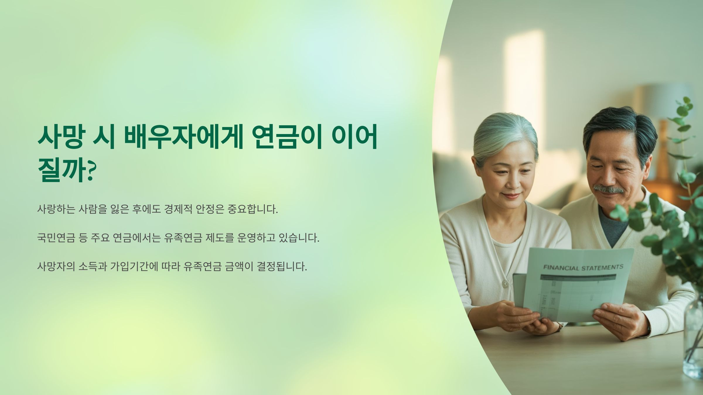 배우자가 세상을 떠났을 때 남은 가족이 받을 수 있는 유족연금은 경제적 어려움을 덜어주는 중요한 사회보장제도예요. 우리나라의 국민연금법에 따르면 가입자가 사망했을 때 배우자와 자녀 등 유족에게 연금을 지급하여 생계를 보장하고 있어요. 이는 단순한 일회성 지원이 아니라 매월 정기적으로 받을 수 있는 연금 형태로 제공되어 장기적인 생활 안정을 도모하고 있답니다.