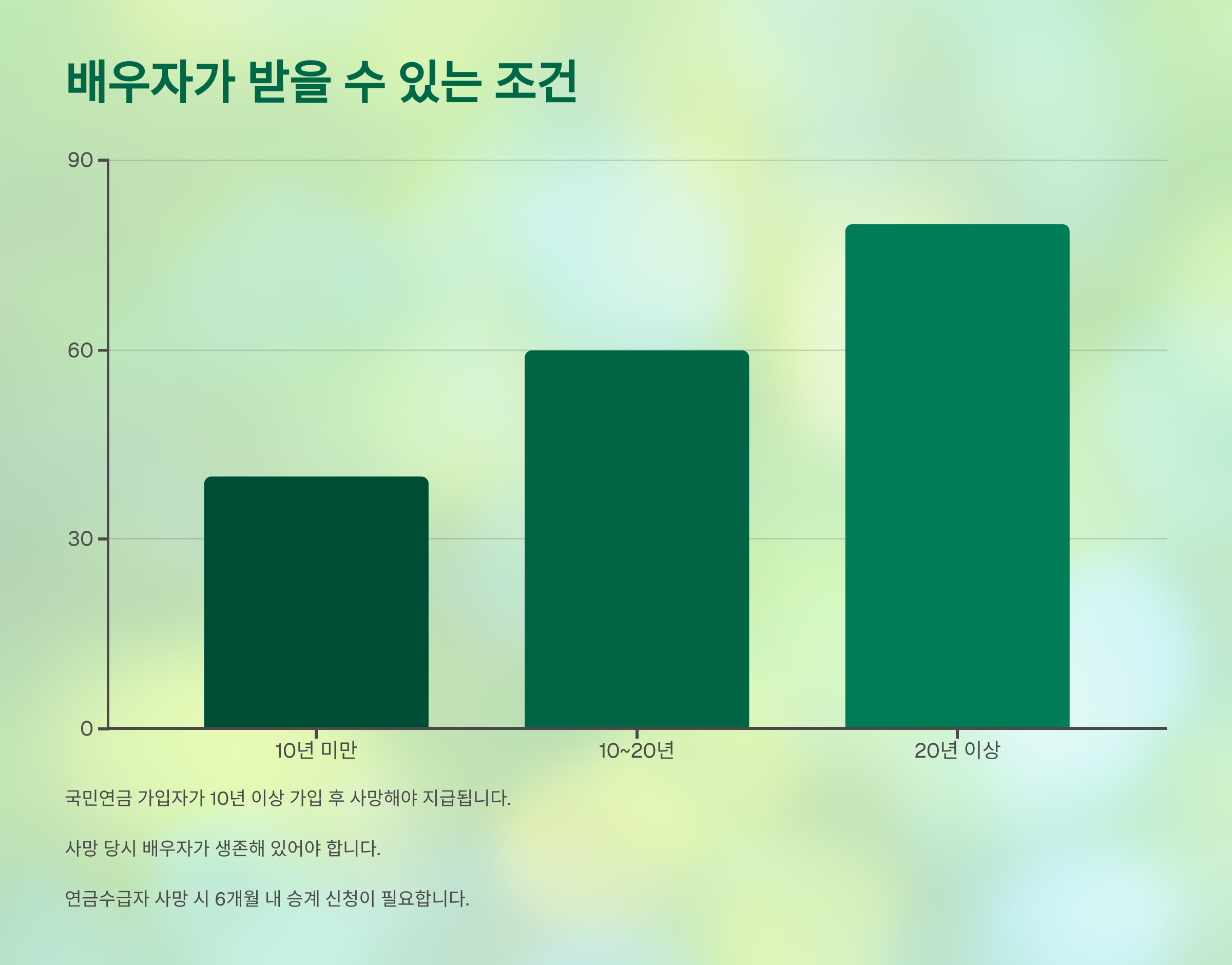 배우자가 유족연금을 받는 데 있어서 특별한 점은 다른 가족구성원과 달리 소득이나 재산에 관계없이 연금을 받을 수 있다는 것이에요. 자녀의 경우 만 18세 미만이거나 장애가 있어야 하고, 부모의 경우 만 60세 이상이어야 하는 등의 조건이 있지만, 배우자는 이런 제한이 없어요. 심지어 배우자가 다른 소득이 많더라도 유족연금을 받을 수 있어서, 경제적으로 여유가 있는 경우에도 연금 수급권은 보장되어 있답니다. 이는 부부관계의 특별성과 배우자의 정신적 피해를 고려한 것으로 해석할 수 있어요.