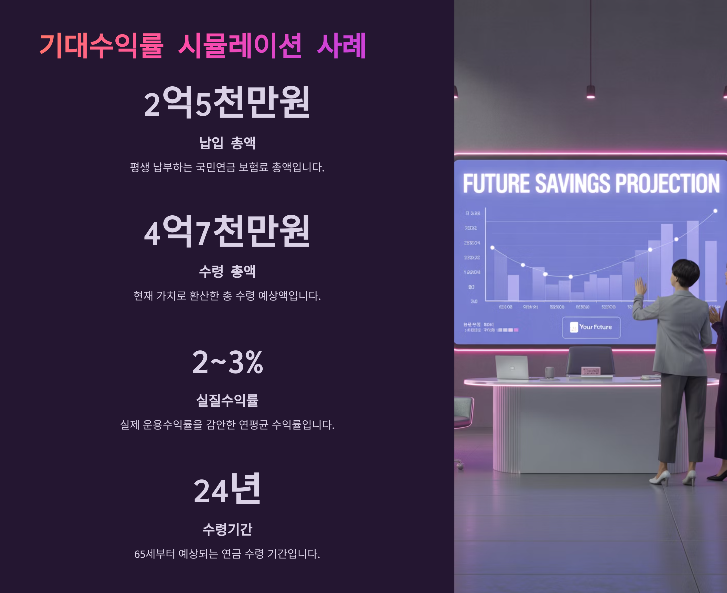 | 40년 납입 / 25년 수령 | 1억 4천만 원 | 3억 원 | 214% |