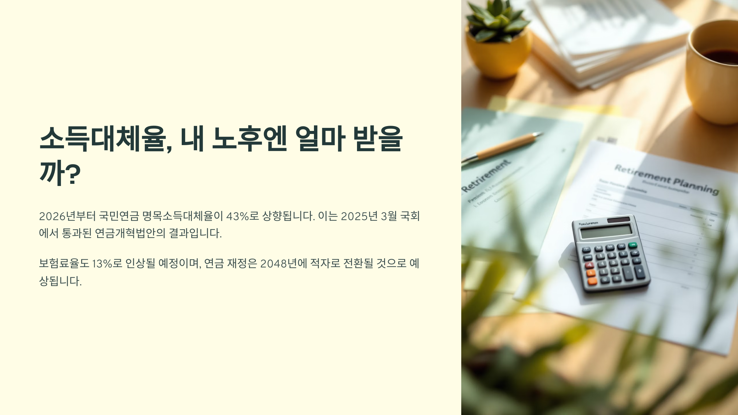 국민연금을 이야기할 때 빠질 수 없는 개념이 바로 ‘소득대체율’이에요. 이건 은퇴 전에 받던 월급 대비 연금으로 받는 금액의 비율을 의미해요. 예를 들어, 월급이 300만 원이었고 연금으로 90만 원을 받는다면 소득대체율은 30%인 셈이에요.