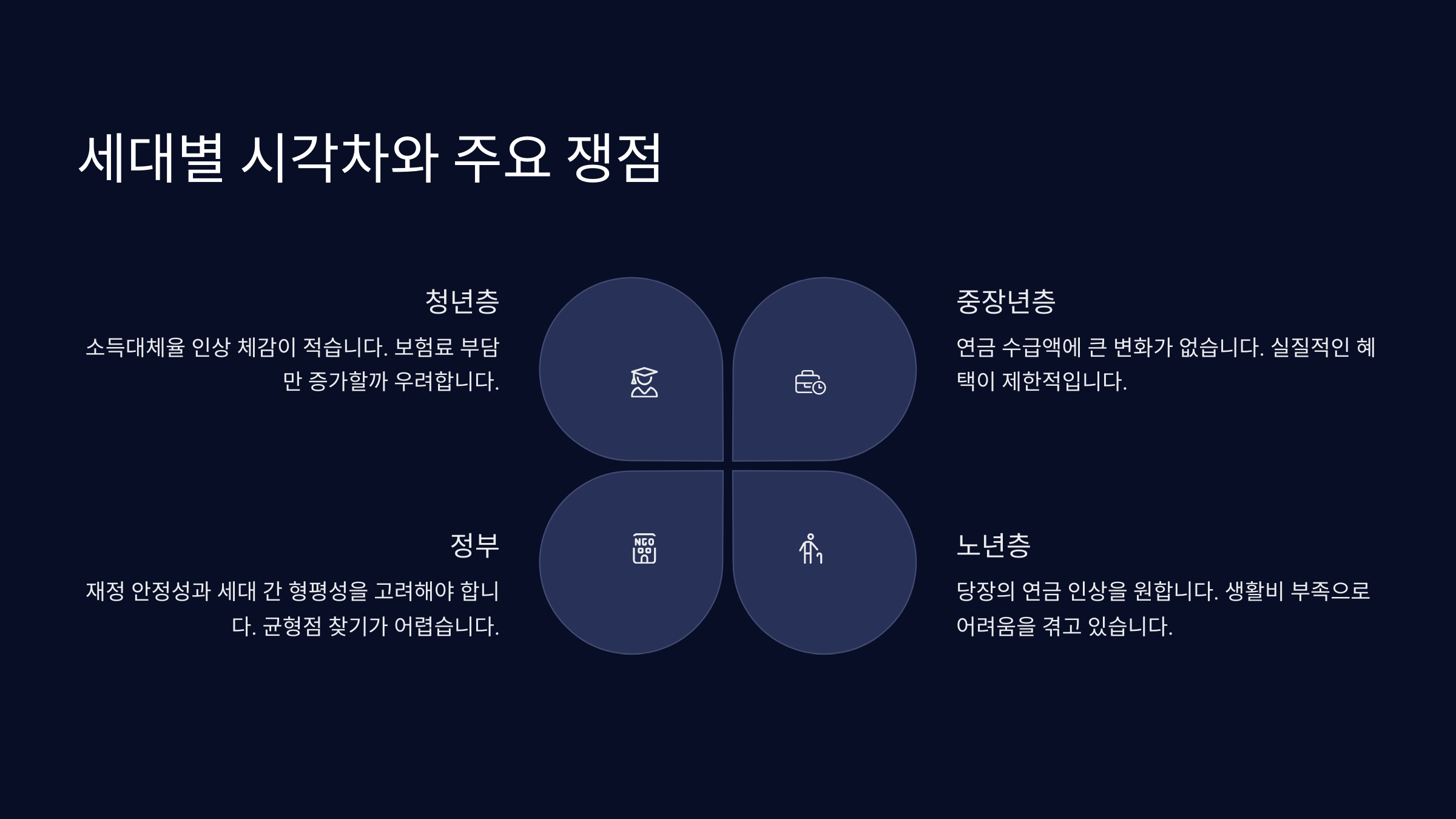40대는 중간적인 입장을 보이고 있는데, 이들은 노후 준비의 필요성을 느끼면서도 자녀 양육비와 부모 부양 부담을 동시에 지고 있는 샌드위치 세대예요. 소득대체율 인상에는 찬성하지만 보험료 인상 시기와 폭에 대해서는 신중한 접근을 원하고 있어요. 이들은 단계적이고 점진적인 개혁을 선호하는 것으로 나타났답니다. 특히 자녀가 성인이 되는 시점과 연계해서 보험료 인상 시기를 조정해 달라는 의견이 많아요.
