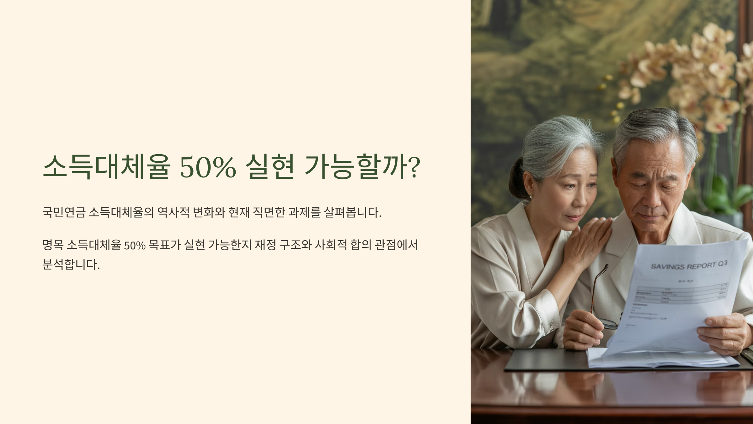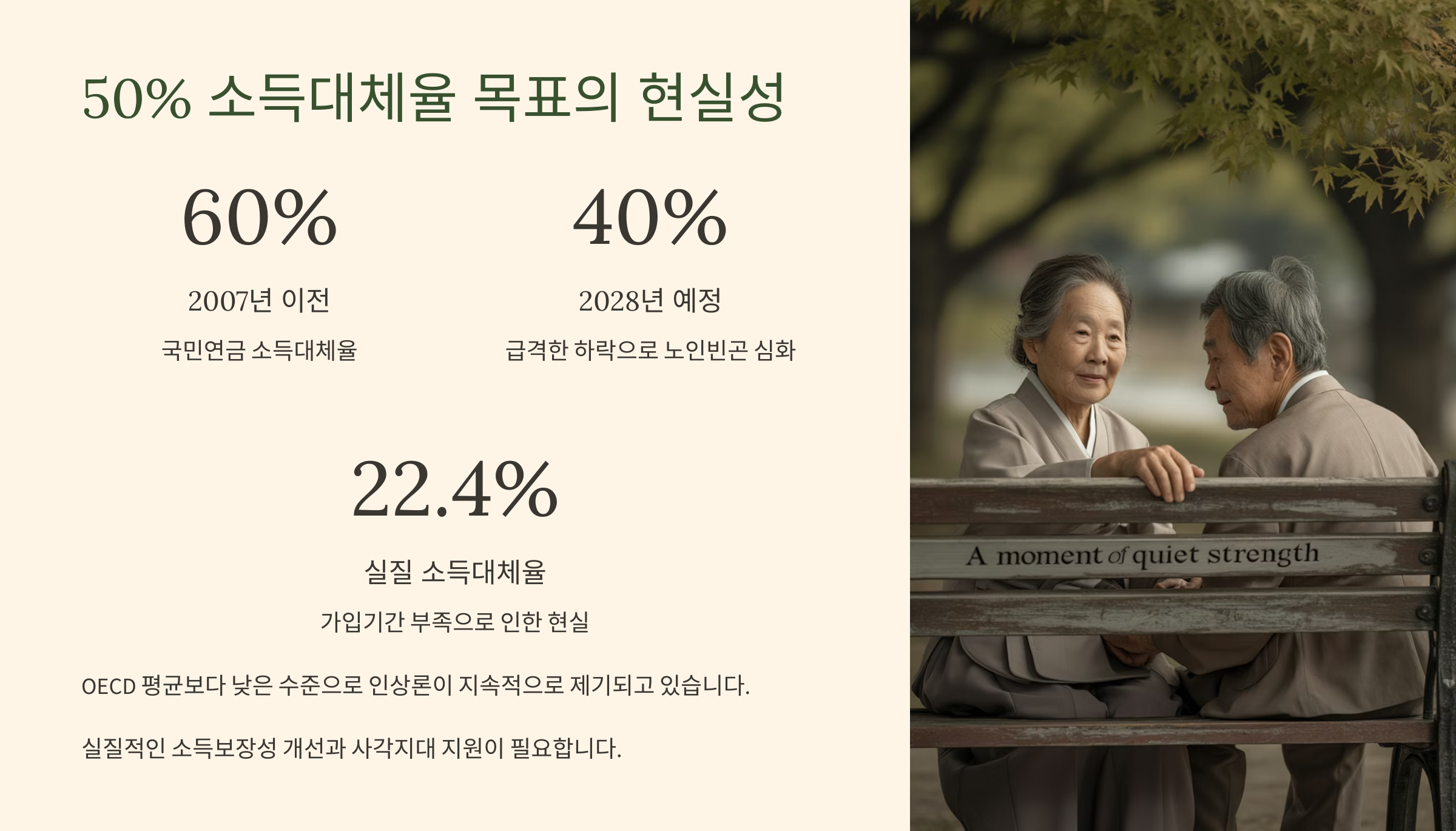 50% 수준의 연금은 노후에 생계 걱정 없이 생활할 수 있는 기본적 안전망 역할을 해줄 수 있어요. 더 나아가 개인이 사적으로 준비해야 하는 연금이나 저축 부담도 줄어들게 되고요.