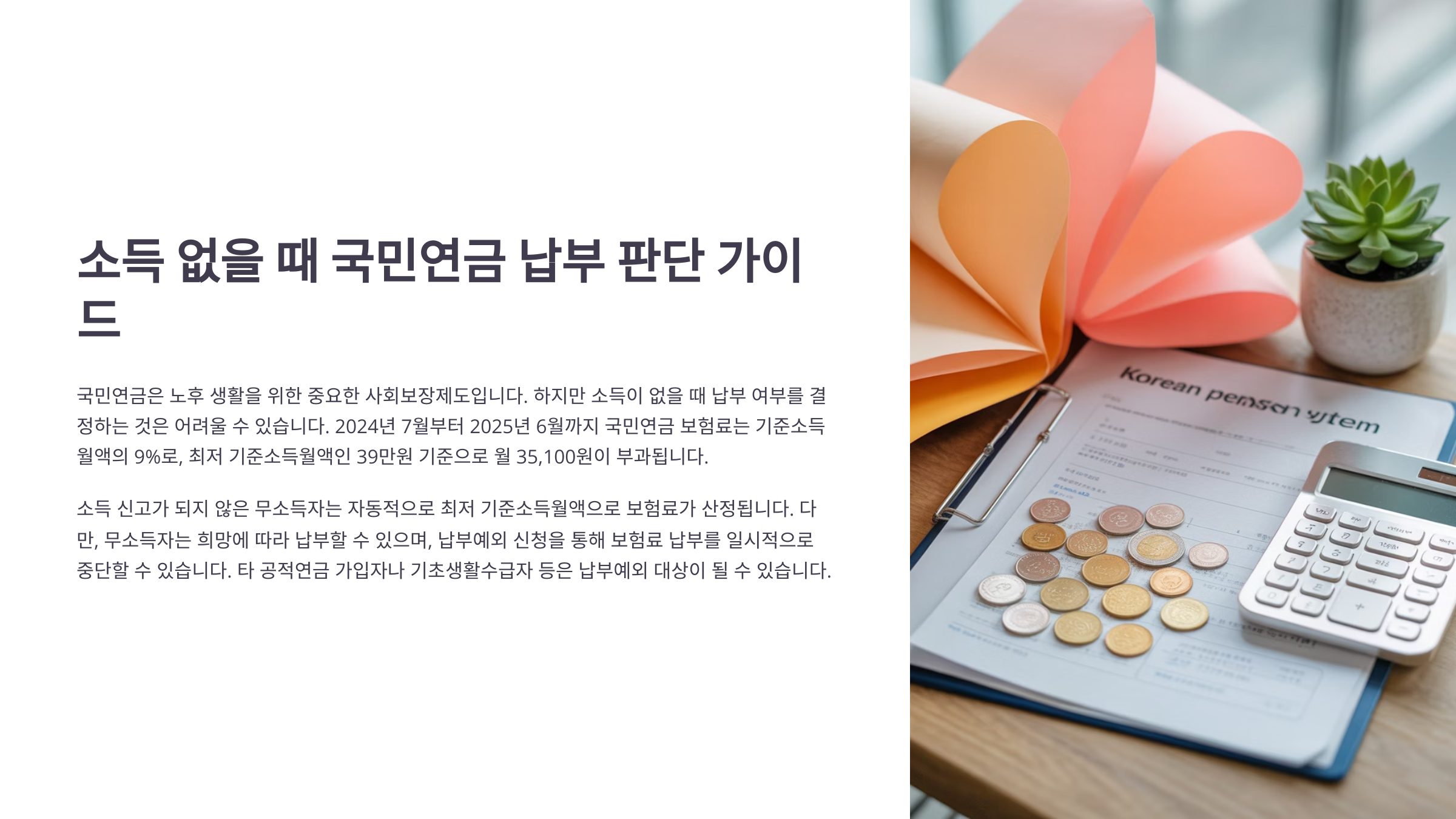소득이 없을 때 국민연금을 계속 내야 할지 고민이신가요? 사실 많은 분들이 실직이나 휴직 상황에서 국민연금 보험료 부담 때문에 걱정하고 계세요. 하지만 무작정 연금을 중단하면 나중에 노령연금을 받을 때 불이익이 생길 수 있어요. 그래서 오늘은 소득이 없을 때도 똑똑하게 국민연금을 관리하는 방법을 알려드릴게요!