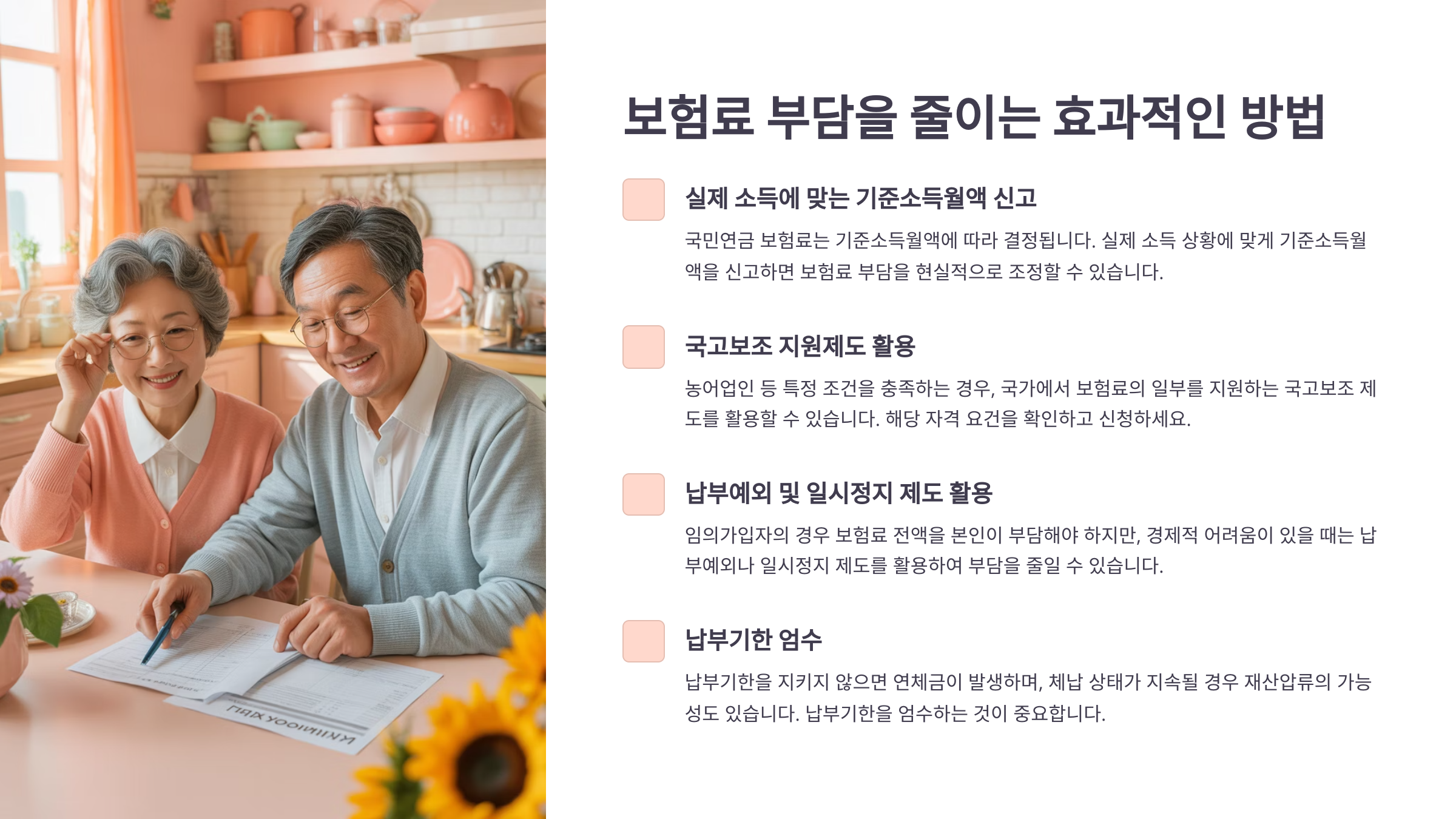 농어업인이나 저소득층의 경우 보험료 지원 제도도 있어요. 농어업인은 보험료의 50%를 정부에서 지원받을 수 있고, 기초생활수급자나 차상위계층은 연금보험료 지원사업을 통해 보험료 일부를 지원받을 수 있답니다. 이런 제도들을 잘 활용하면 보험료 부담을 크게 줄일 수 있어요!