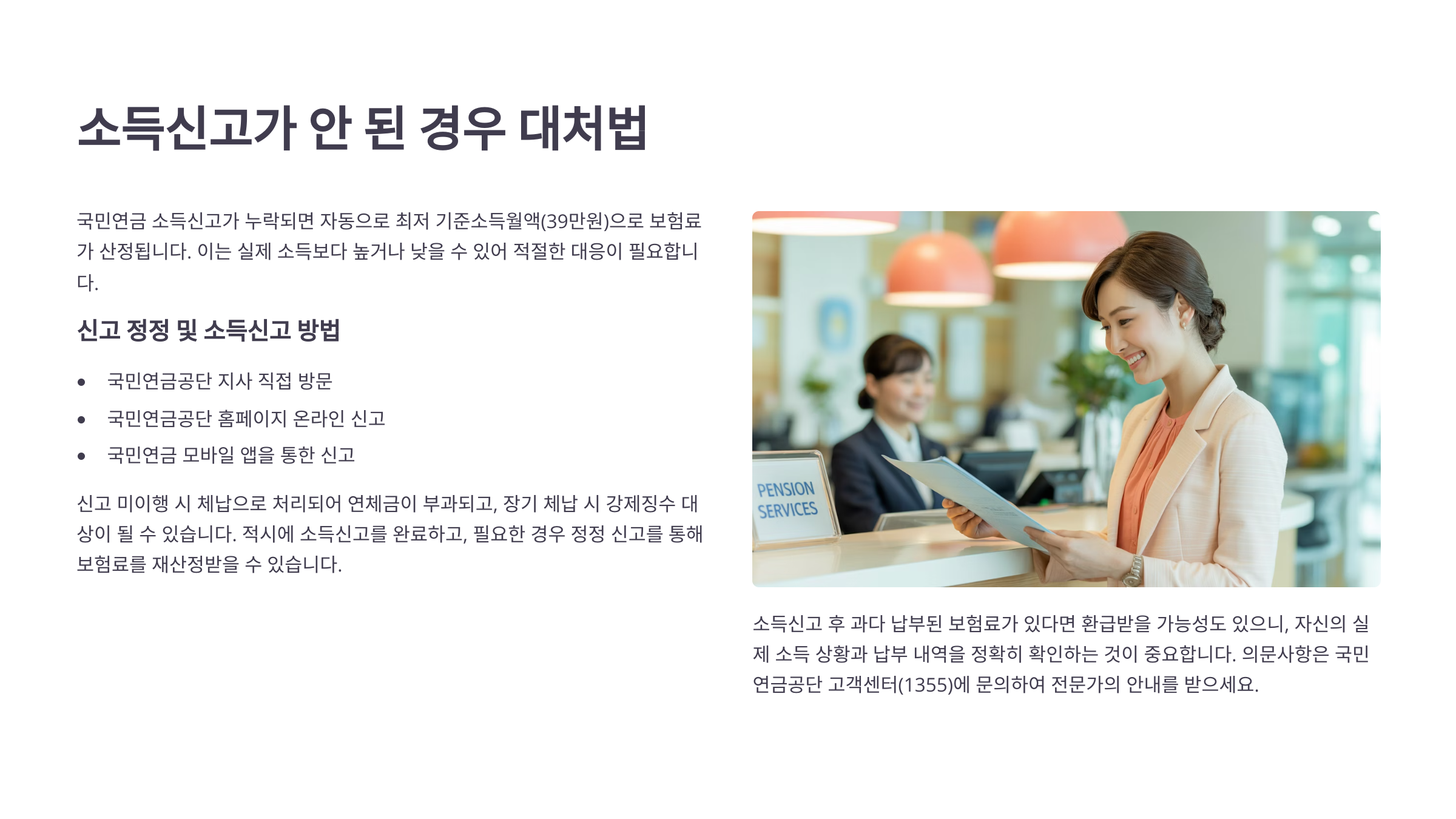 소득신고와 관련해서는 국민연금공단 콜센터(국번없이 1355)를 활용하는 것도 좋은 방법이에요. 상담원이 개인별 상황에 맞는 맞춤형 안내를 해주고, 필요한 서류나 절차도 자세히 알려준답니다. 특히 복잡한 소득 구조를 가진 경우에는 전문 상담을 받는 게 훨씬 도움이 돼요! 😊