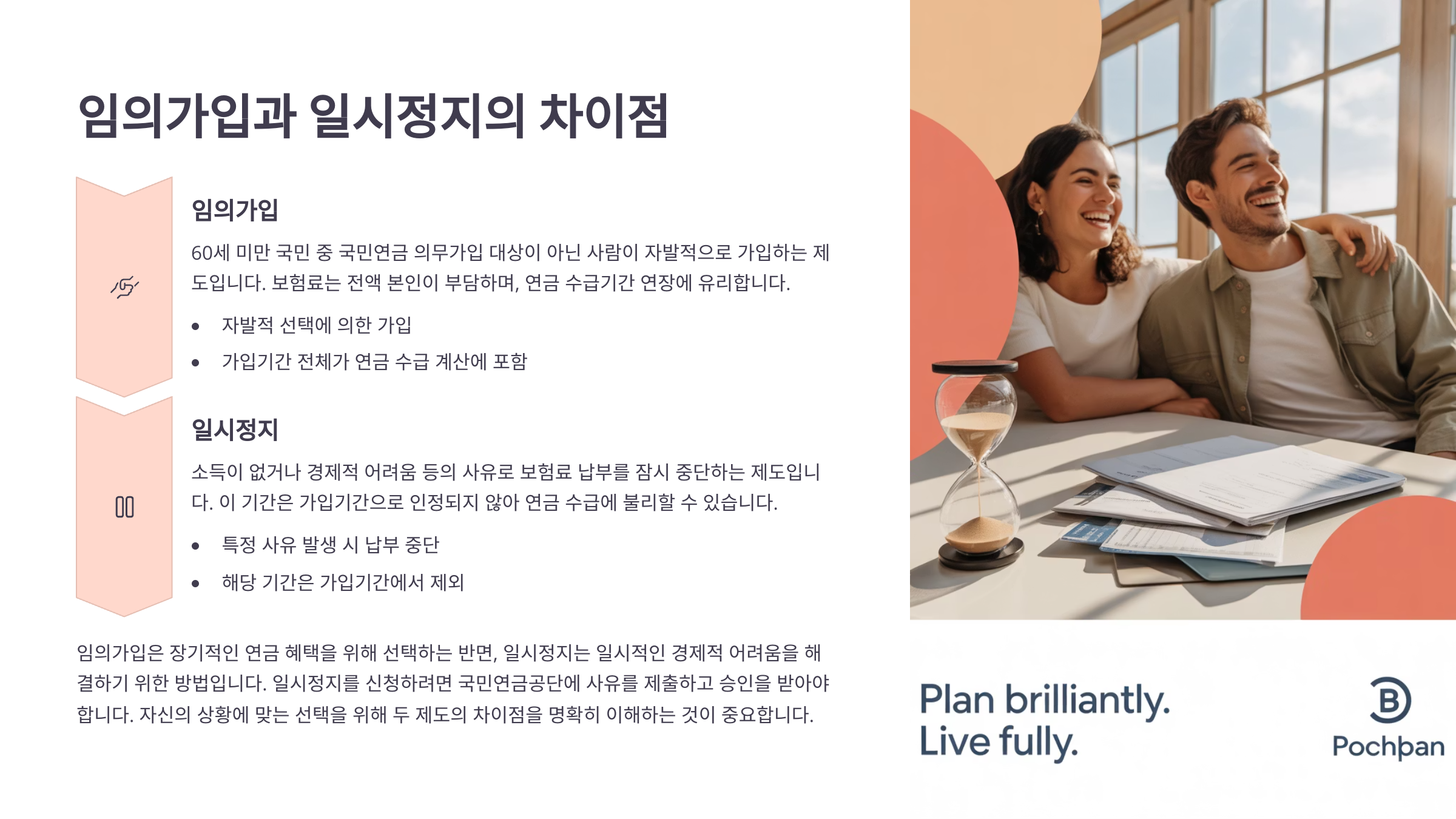 임의가입과 납부예외 중 어떤 걸 선택할지는 개인의 상황에 따라 달라요. 만약 최소한의 보험료라도 낼 여력이 있다면 임의가입이나 임의계속가입을 유지하는 게 좋아요. 가입 기간이 계속 쌓이면서 노령연금 수급 요건을 충족하는 데 도움이 되거든요. 반면 정말 경제적으로 어려운 상황이라면 납부예외를 신청해서 부담을 덜고, 나중에 추납하는 방법을 선택할 수 있어요.