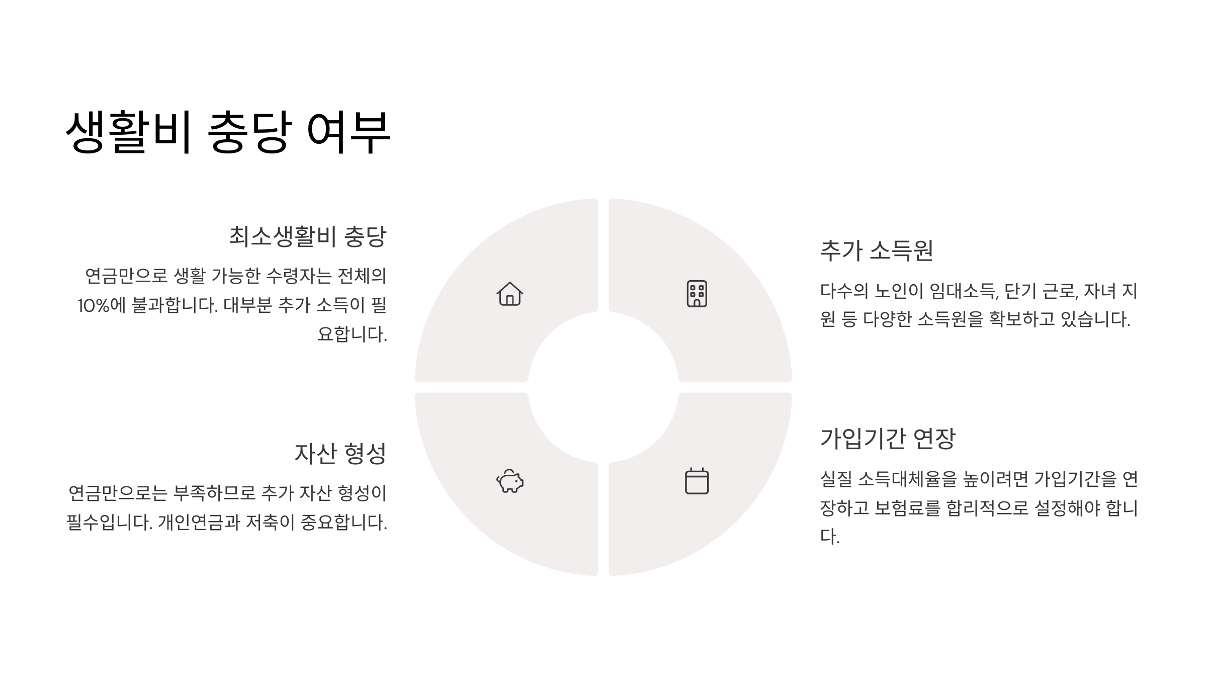 그리고 어떤 분은 자녀와의 동거, 임대수익, 기타 개인연금 등 다양한 소득원을 병행해 연금 수령을 보완하고 있었어요. 즉, 국민연금만으로는 노후를 100% 책임지기엔 부족한 현실이죠.