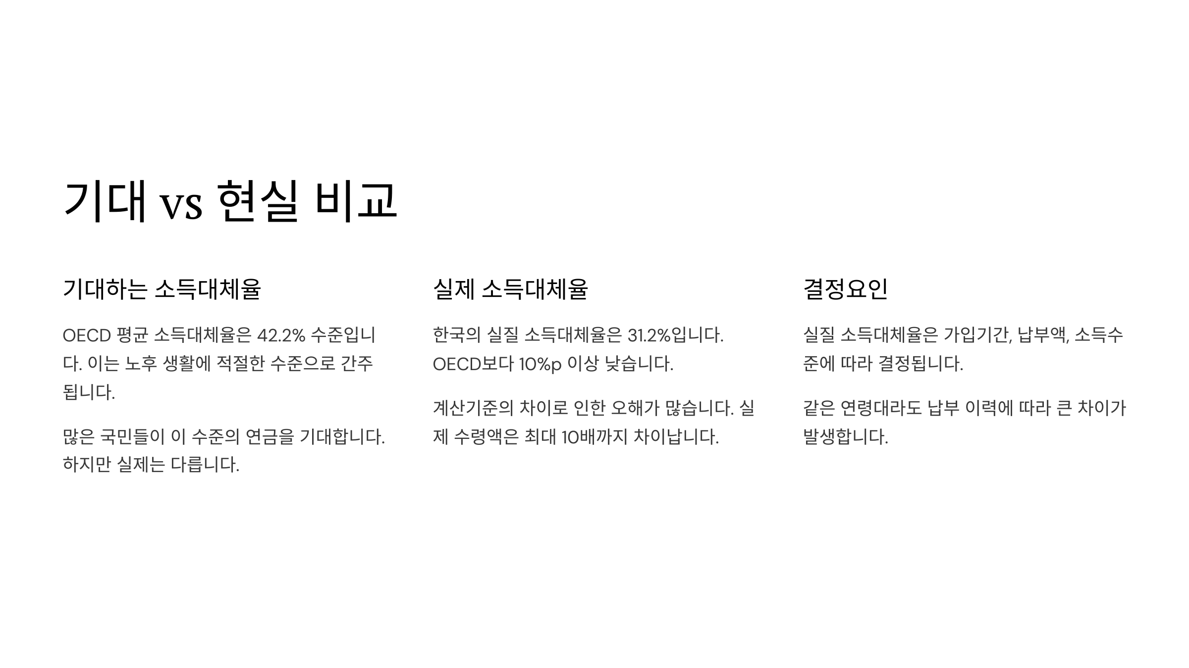 기대치와 현실의 차이가 발생하는 이유는 다양해요. 먼저, 국민연금의 ‘소득대체율’ 개념을 오해하는 경우가 많아요. 예를 들어 69%라고 하면, 현재 월급의 69%를 받는 것으로 착각하기 쉬워요. 사실은 평균 소득을 기준으로 산정된 수치이기 때문에, 실제 개인의 기대와는 차이가 발생할 수밖에 없어요.