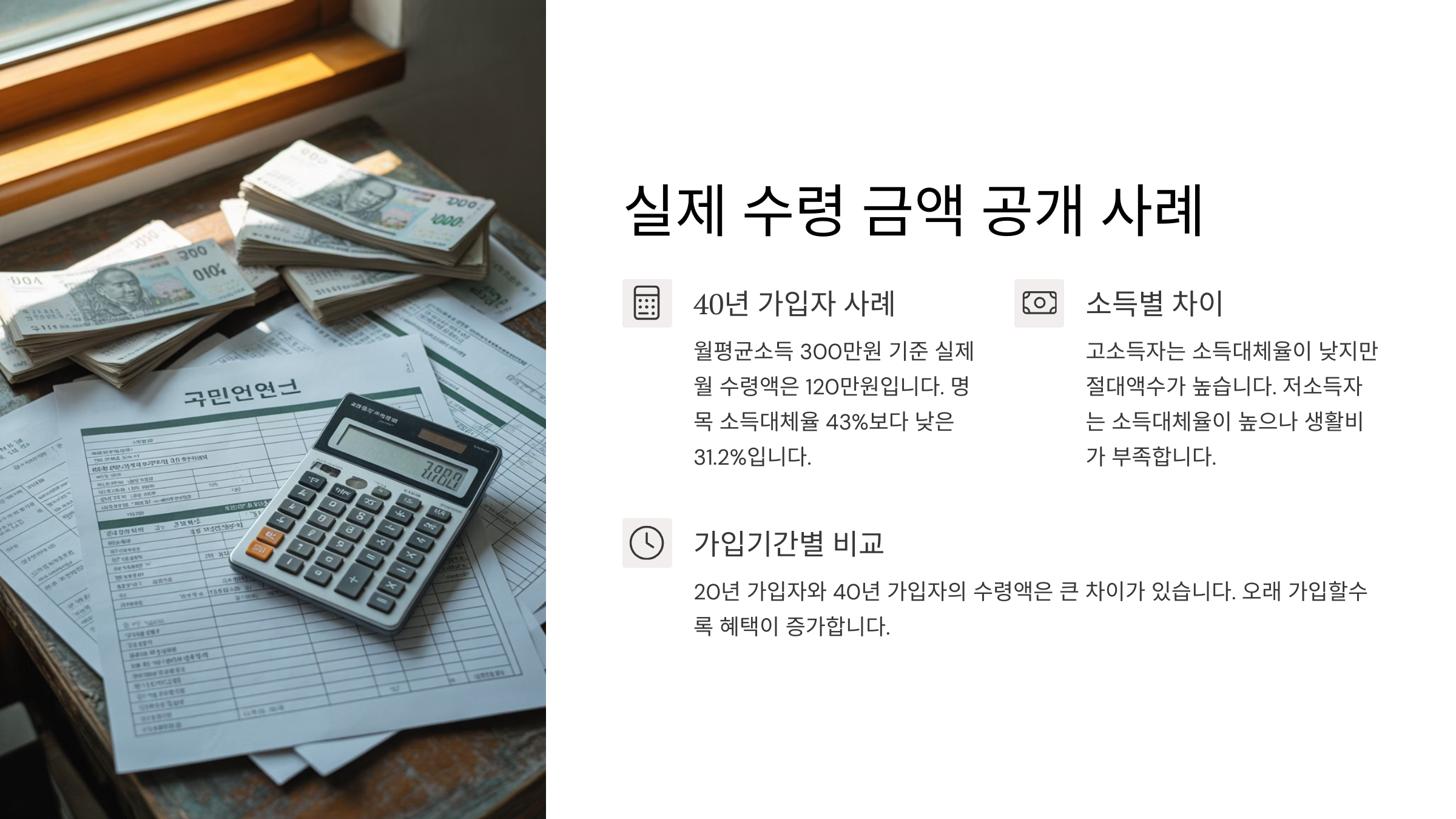 그리고 납입기간이 충분치 않거나, 중간에 납부가 중단된 경우도 현실 수령액을 크게 줄이는 요소 중 하나예요. 자영업자나 프리랜서처럼 일정치 않은 소득을 가진 분들의 경우 더 큰 차이를 느끼게 돼요.