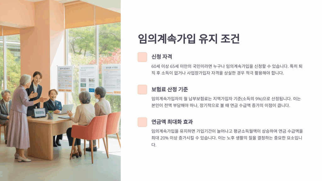 임의계속가입은 퇴직 후에도 국민연금을 계속 납부할 수 있는 제도예요. 이 제도를 활용하면 연금 수령액을 늘리고 가입 기간을 채울 수 있어서 많은 퇴직자들이 선택하는 방법이랍니다. 하지만 아무나 가입할 수 있는 건 아니고, 특정 조건을 충족해야 해요. 먼저 국민연금 가입 이력이 1개월 이상 있어야 하고, 60세 미만이어야 신청이 가능해요.
