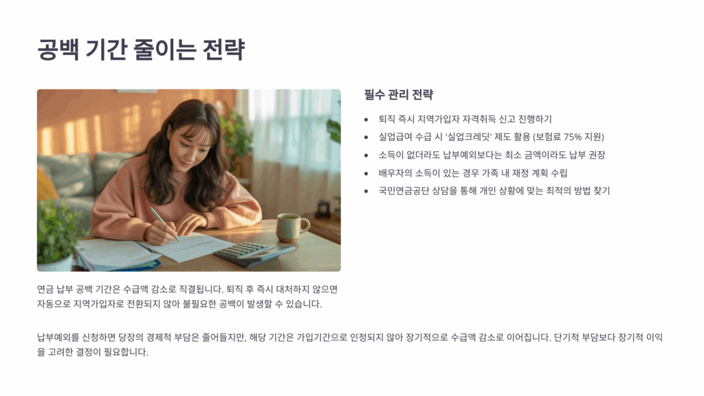공백 기간이 이미 발생했다면 추후납부 제도를 활용할 수 있어요. 과거 10년 이내의 납부 예외 기간에 대해 보험료를 소급해서 낼 수 있는 제도인데, 당시 보험료에 이자가 가산되긴 하지만 공백을 메울 수 있는 좋은 방법이에요. 추후납부는 분할 납부도 가능하니까 한 번에 큰 금액이 부담스러운 경우 나눠서 낼 수 있답니다. 📅