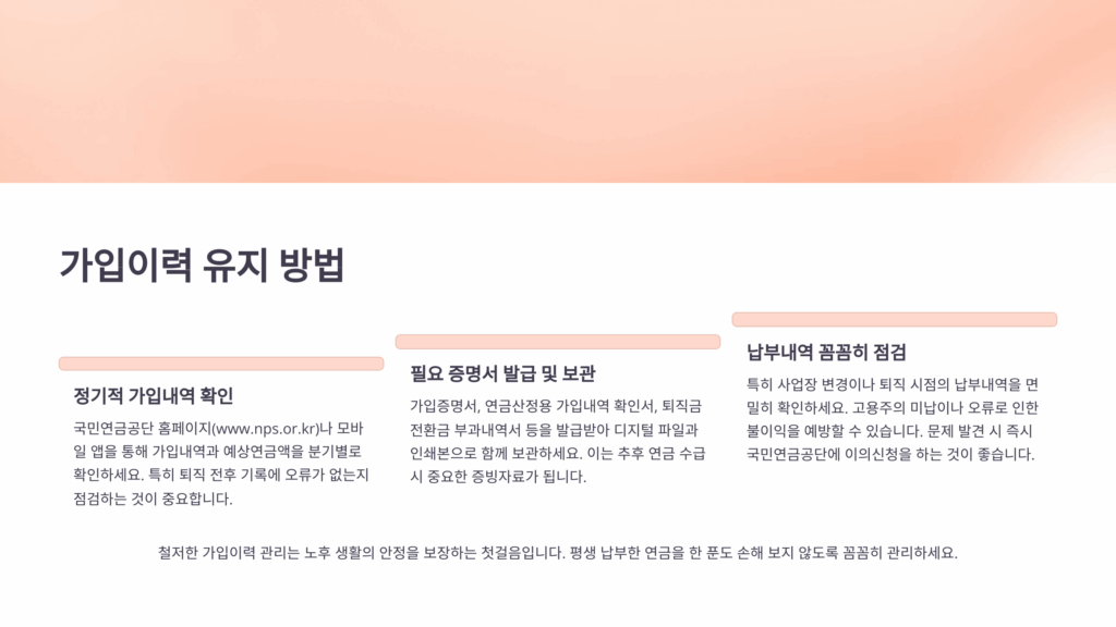 임의계속가입을 유지하려면 매월 보험료를 성실히 납부해야 해요. 3개월 이상 체납하면 자격이 상실될 수 있으니 자동이체를 설정해두는 것이 안전해요. 또한 재취업을 하게 되면 사업장가입자로 전환되기 때문에 임의계속가입 자격이 자동으로 종료돼요. 이런 경우에는 새로운 직장에서 다시 국민연금에 가입하게 되니 걱정하지 마세요! 💪