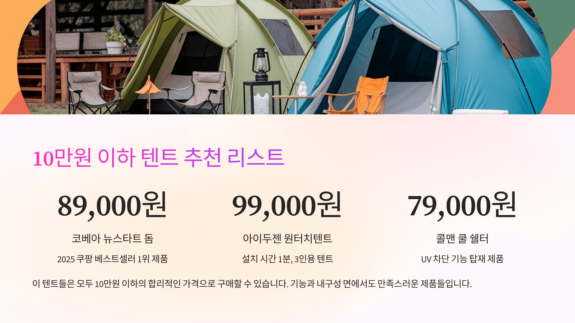 그 외에도 ‘웨이브힐 슬림 텐트’, ‘파세코 원터치 미니’ 등은 쿠팡, 네이버쇼핑 등에서 할인 때 7만원대에도 구매 가능해요. 검색만 잘하면 진짜 보석 같은 텐트 발견할 수 있어요!